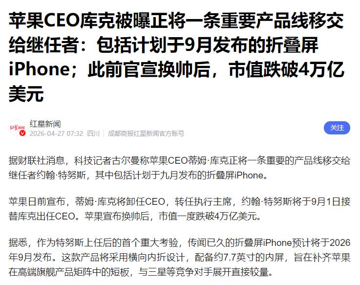 库克现在提前交棒,最受关注的就是把折叠屏iPhone交给了特努斯。这不是瞎传,是知名科技记者古尔曼4月27日报道的,这人常年盯苹果,消息从没差过。