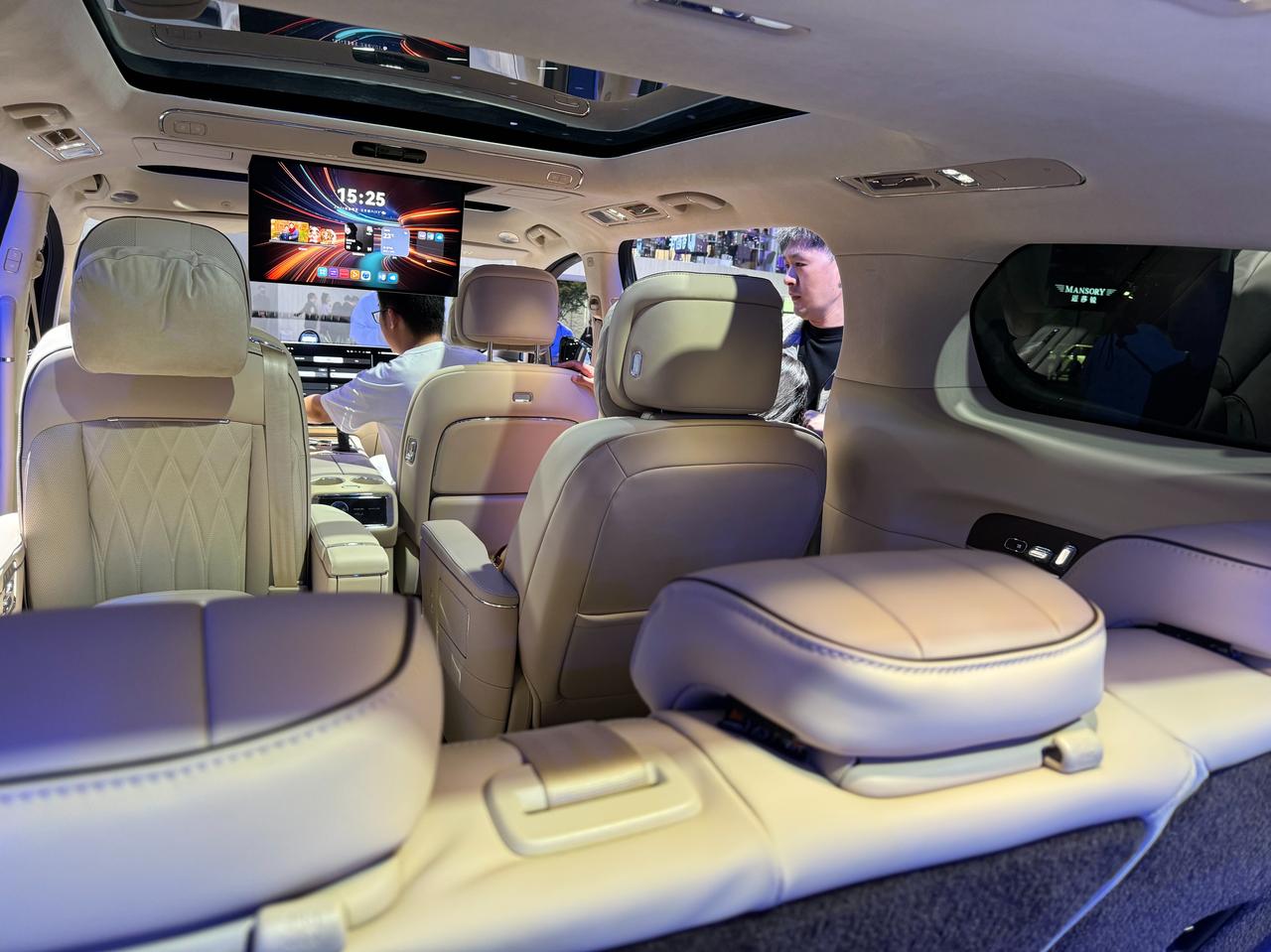 智界 V9 ,预售价 39.98 万元起,车身尺寸 5359-2009-1879mm,轴距 3250mm,舱内纵向 3660mm,舱内总容积比埃尔法大 377L,二排头空 1094mm、肩部空间 1632mm,三排支持 200mm 滑移,彻底打破 “第三排将就论”。二排双旋转座椅,支持 45° 迎宾、90° 观景、180° 对坐,可拓展 3.2㎡会客厅,还能秒变 2.06m×1.57m 大床,搭配 52 处储物空间与 790L 后备箱,满足全场景需求。