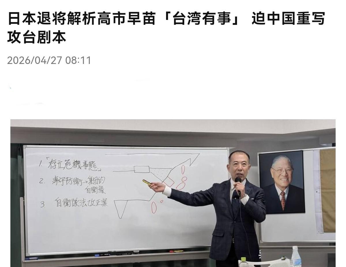 4月27日,根据岛内媒体报道,日本退将小川清史声称,高市早苗市的发言极具冲击性,等于表明日本可能在平时阶段就介入,这已打破了中国原有作战前提,迫使中国必须重写收台的剧本。这是非常大的战略讯号。