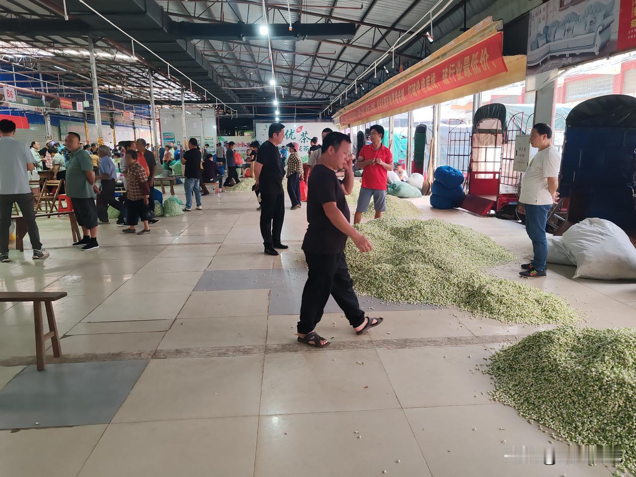 今天7点多的时候开始下雨,一直到中午12点这样才停雨,之后出了一点太阳,一直到下午的4点多,受天气影响和产量的变化,今天的茉莉花收购价格是8元/斤,最高价格是9.5元,有些商户为了完成任务,还得到路口这里抢花,每次产量少的时候都会出现这种情况,不抢花,完成不了收购任务,就完成不了茉莉花茶的制作,因为茉莉花茶的制作它是要连续的过程,中间突然断开一天,那么说前几天的就前功尽弃了,所以得连续的收花来制作。