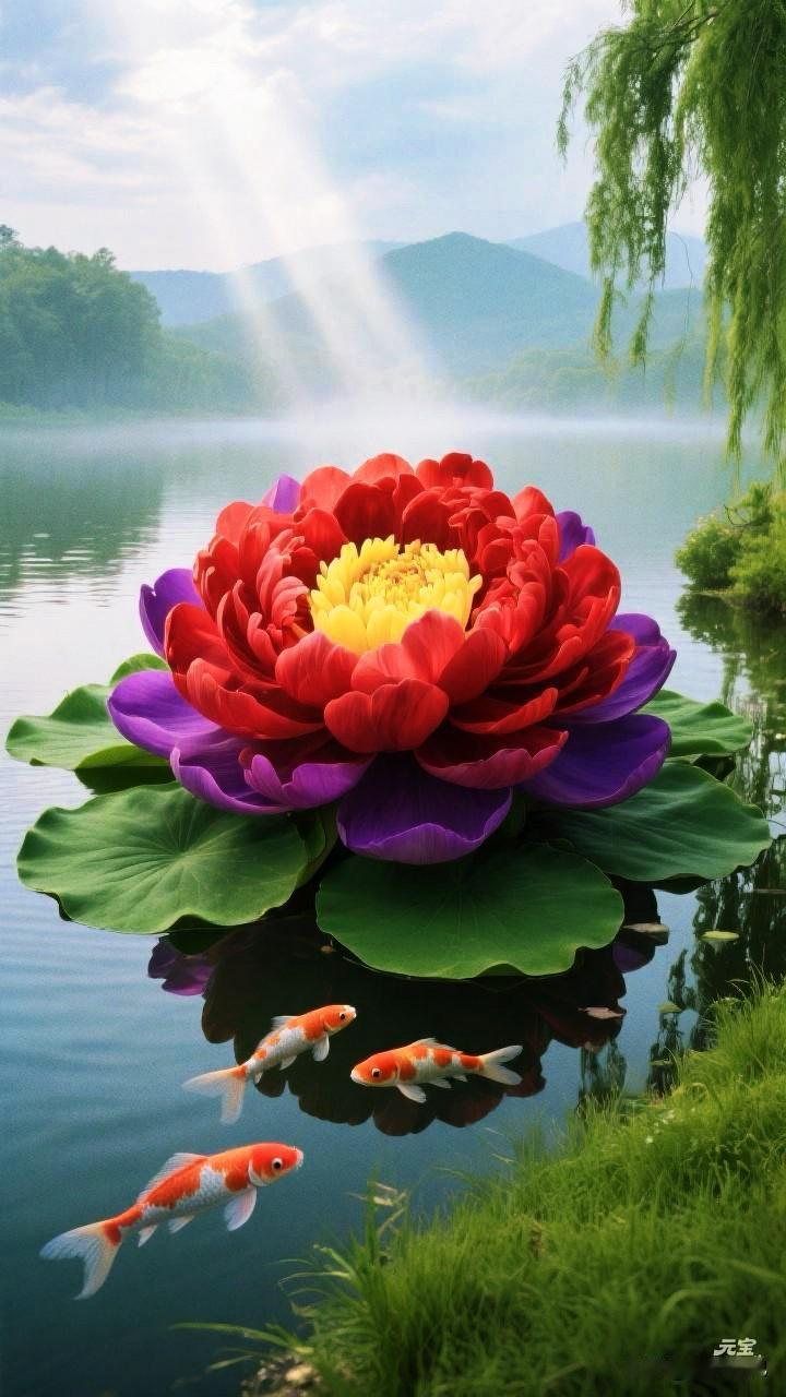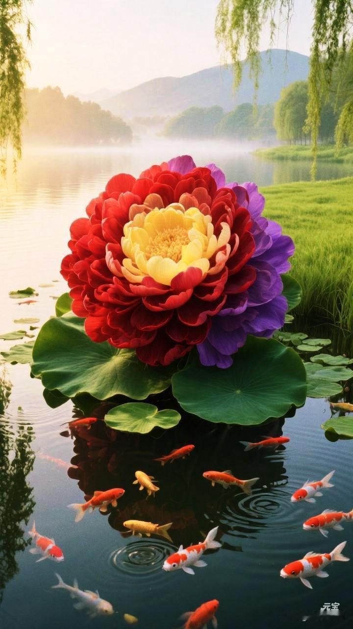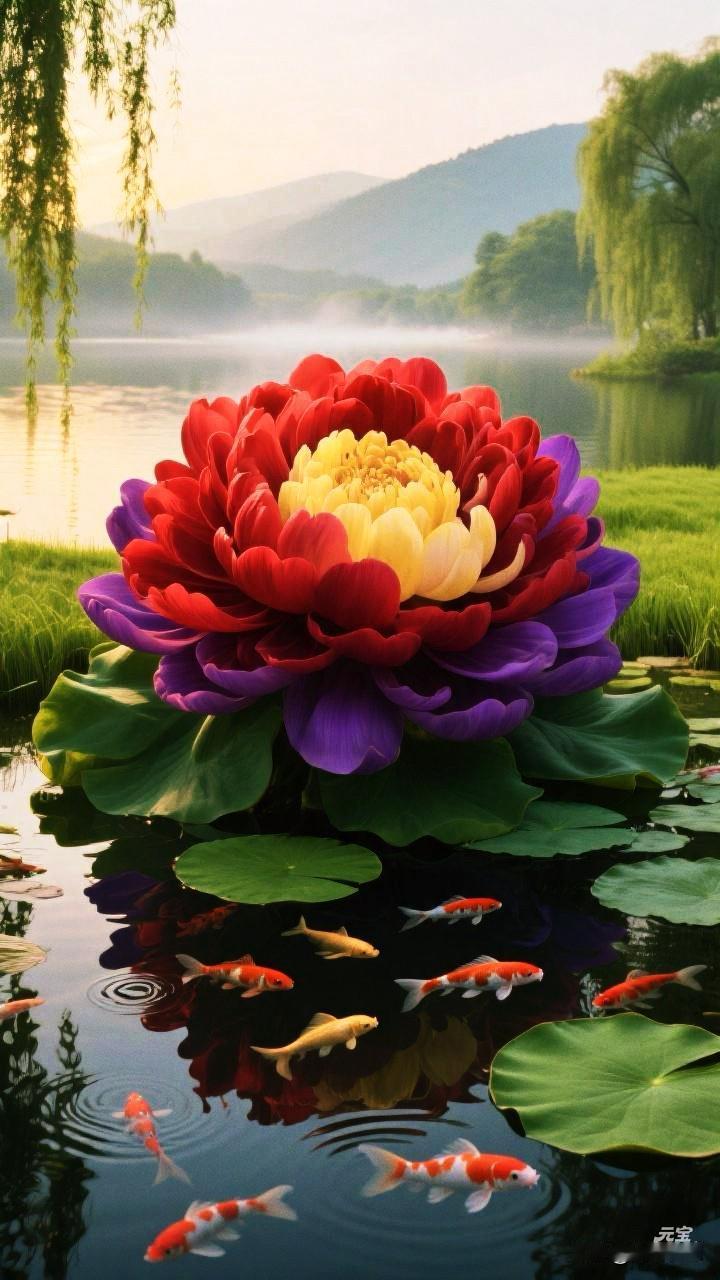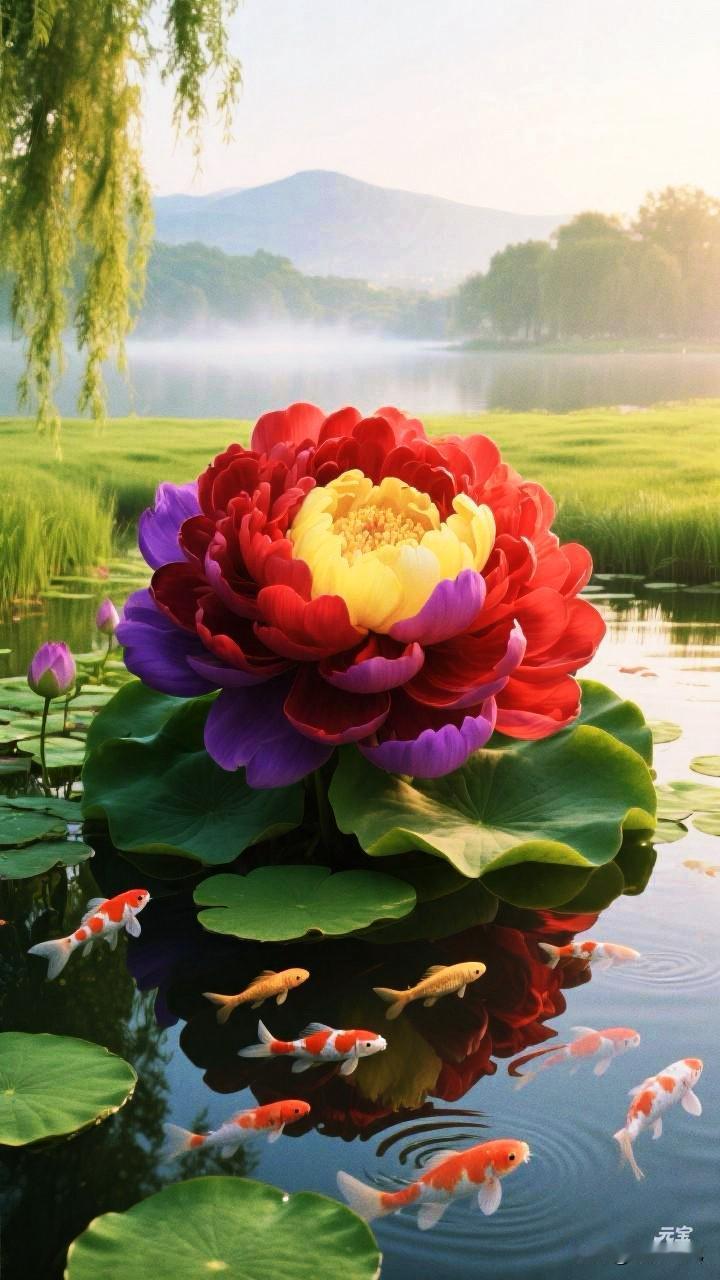 眸里,红紫黄层层叠叠,像打翻的调色盘,如梦似幻,色彩浓烈而和谐,巨型莲花,绽放于湖面,锦鲤游弋其下,柳丝轻挽晨光,远山静听水语……[祈祷]