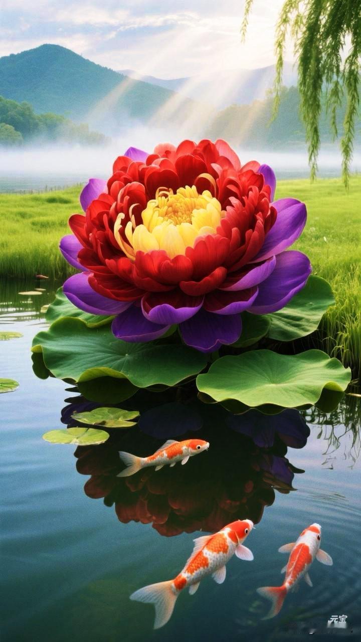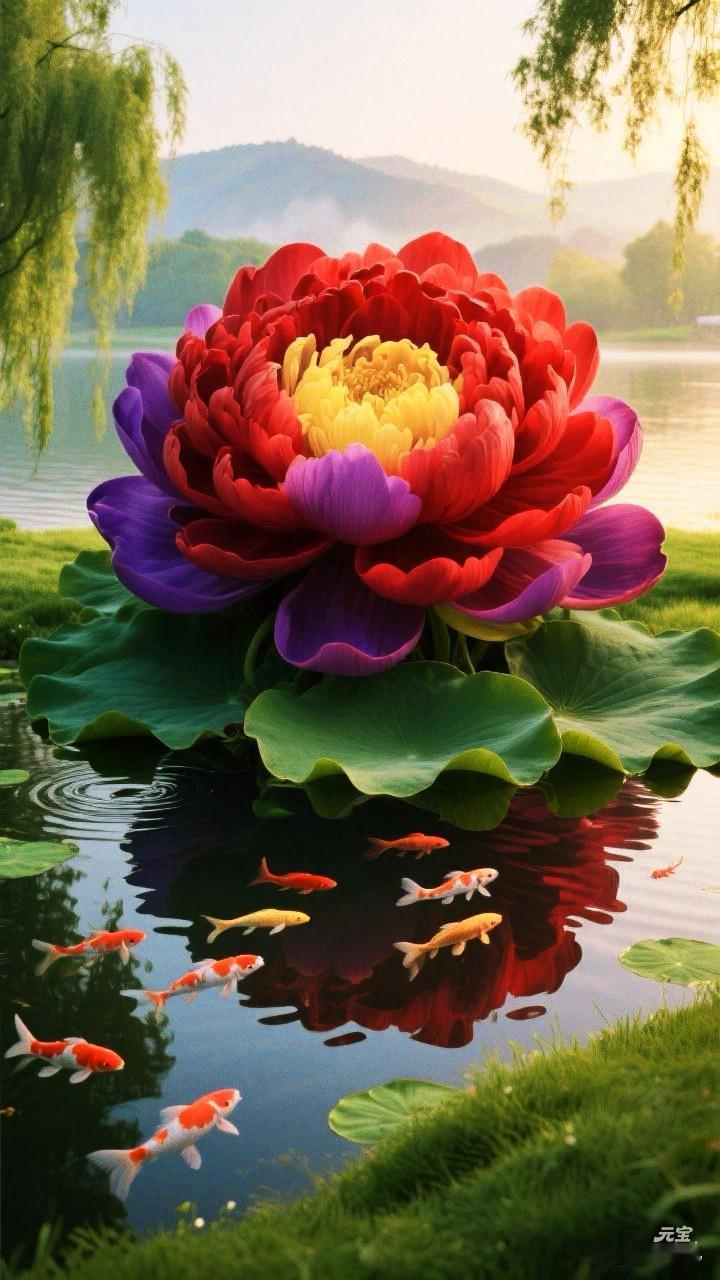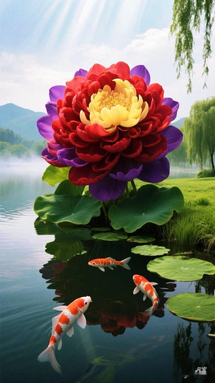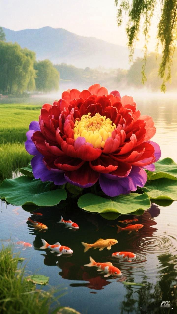 眸里,红紫黄层层叠叠,像打翻的调色盘,如梦似幻,色彩浓烈而和谐,巨型莲花,绽放于湖面,锦鲤游弋其下,柳丝轻挽晨光,远山静听水语……[祈祷]