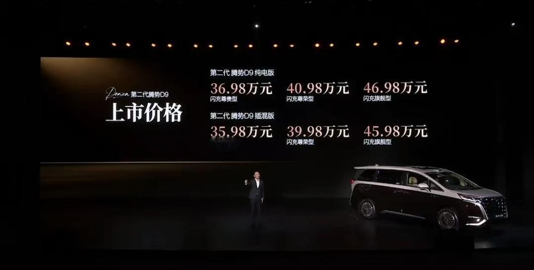 第二代腾势 D9 上市,提供插混、纯电两种动力,升级了第二代刀片电池 + 天神之眼 5.0 ,纯电版 CLTC 续航 800 km,插混纯电续航 401 km,依旧是 5 分钟充好,9 分钟充饱