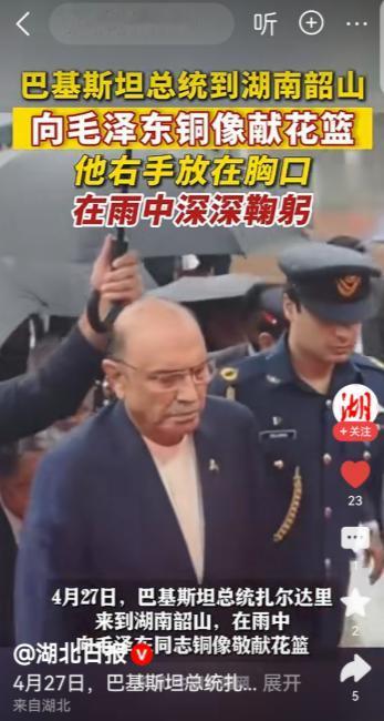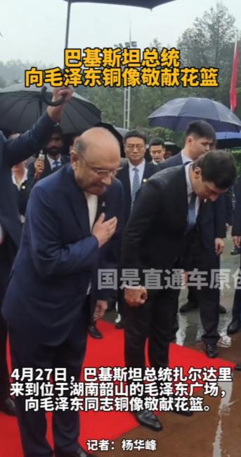 巴基斯坦总统扎尔达里在长沙致敬毛泽东雕像;4月27日,巴基斯坦总统扎尔达里前往湖南韶山,冒雨向毛泽东同志铜像敬献花篮,这一充满仪式感的举动,传递出中巴友谊的深厚温度。
