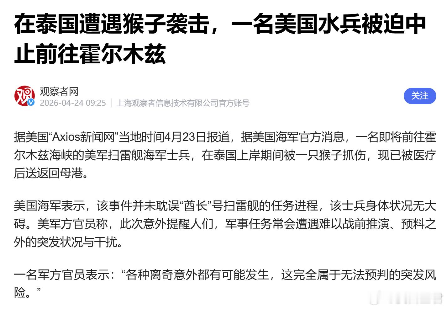 刚刚,号称世界最强军队的美军接连爆出两大丑闻,不光特朗普的脸被打肿了,好莱坞那些电影所营造出的盛世假象也彻底骗不下去了。怎么回事呢?先说第一件事,非常的离奇。一名即将前往霍尔木兹海峡执行扫雷任务的美国海军士兵,在泰国上岸期间被一只猴子抓伤。