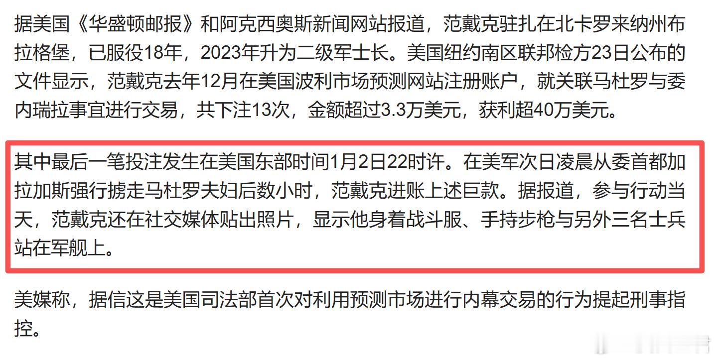 这也是咱们要说的美军爆出的第二个丑闻。美国司法部逮捕了一名参与绑架马杜罗的特种兵,因为他在美军行动开始之前就利用机密消息在网上下注。用3.3万本金,赚了超过40万美元。其中最后一笔投注,就发生在行动开始前的几个小时。这可是美国人自己承认的,司法部的文件,起诉书上面都有。