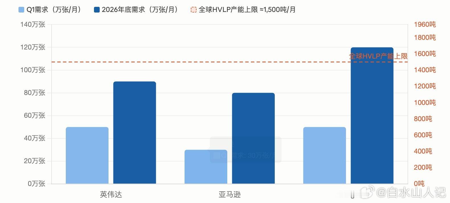 三大CSP的AI服务器平台同时转向HVLP4。英伟达Rubin平台全线导入,亚马逊Trainium 3的UBB和switch tray升级,Google从V8x开始所有新平台全面转向。券商的需求测算,英伟达CCL需求从Q1的50万张/月到年底90万张,亚马逊30到80万张,Google 50到120万张。对应HVLP4需求从284吨/月拉到1,676吨/月。
