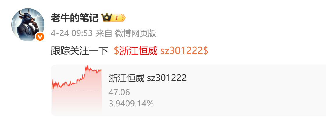 跟着老牛走,喝酒吃肉都会有:老牛在4月24日跟踪关注的 浙江恒威 今日盘中最
