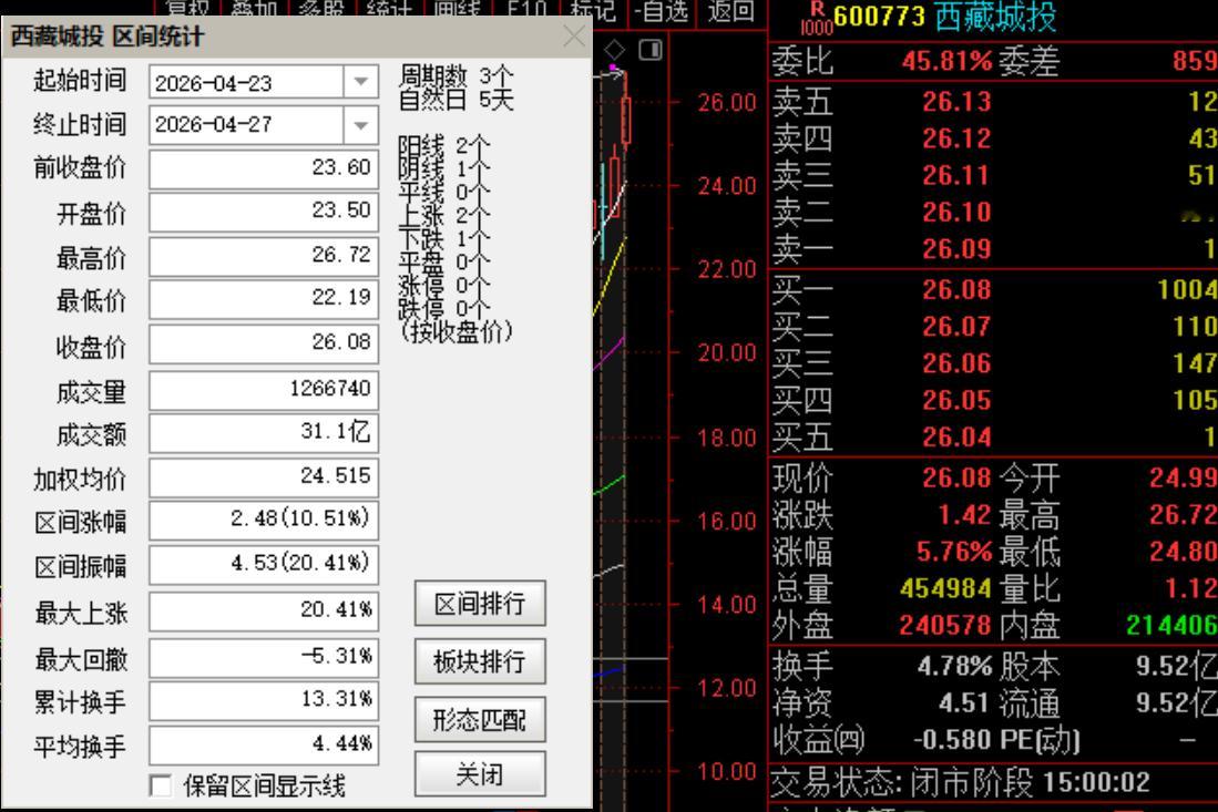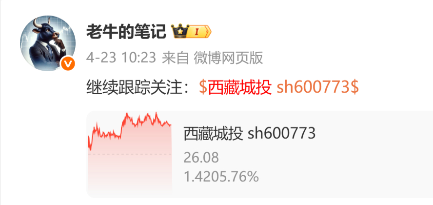 老牛在4月23日公开分--享的关注:西藏城投 今天盘中最高也来到了26.72元!
