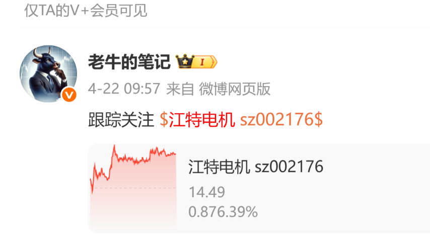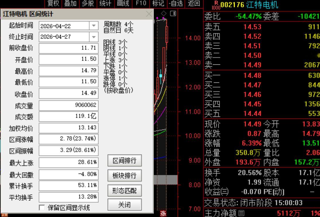 4月22日关注的 跟踪关注 江特电机 今日盘中最高来到了 14.79元!