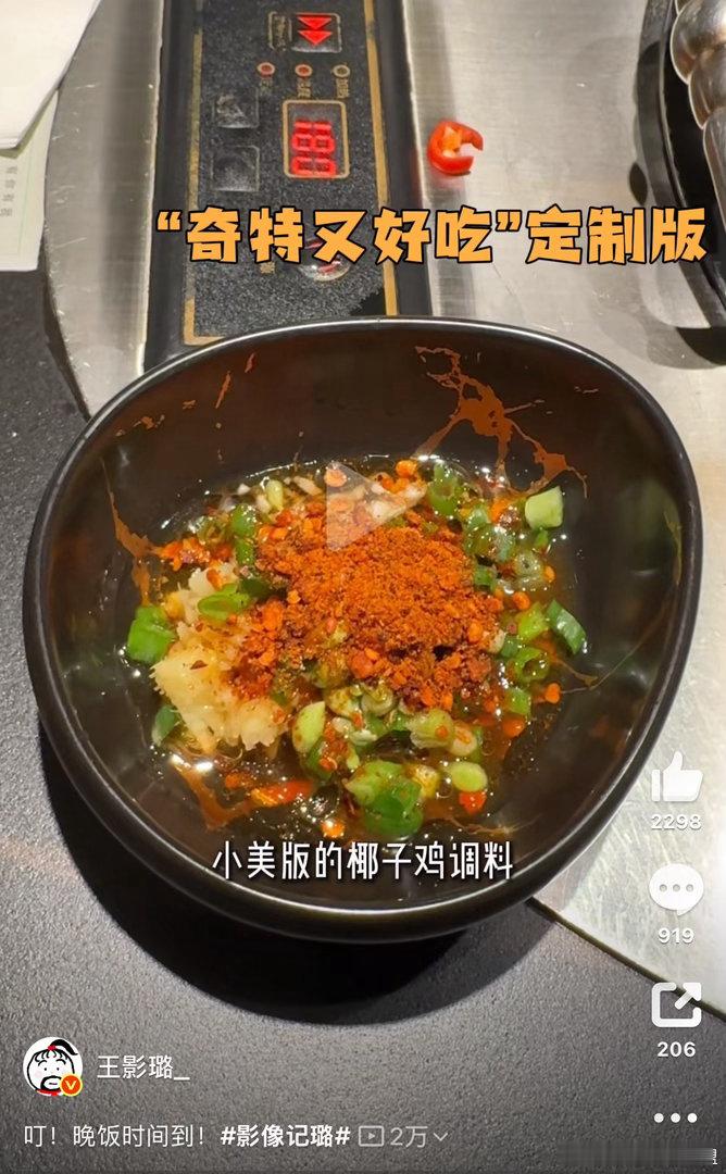 王影璐把椰子鸡吃成了四川火锅本以为吃椰子鸡主打一个原汁原味,直到看见王影璐调的这碗灵魂蘸料……这一碗的辣椒面直接把椰子鸡拉到了川渝地界,隔着屏幕已经看饿了!