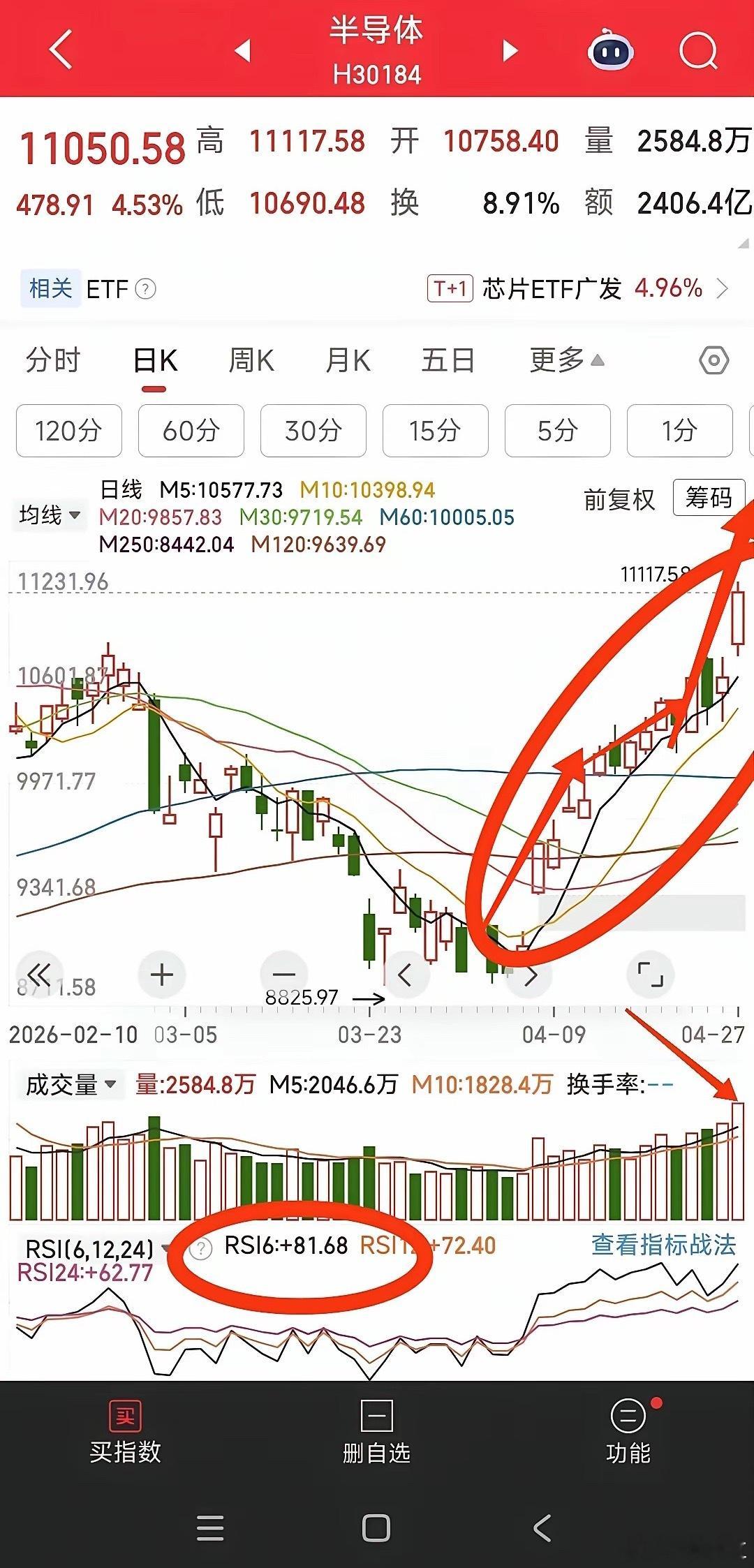 图2 突破趋势反压线回踩确认走加速,macd红柱由缩小开始放大,多头回归图1 红K线由长到短再到长,说明多头停顿修整后继续加速上涨,完成后转为空头的潜力较大,这是对一个波段行情的分析与判断今天爆量大阳线,这是出货迹象5日乖离率=4偏高,RSI=81超买,两者配合股价即使不是最高点也离最高点不远现在前期高点不宜做多,突破后回踩才是最佳买点突破不了就等回调,阳包阴转强后进场半导体已经走强了后期要多注意,有资金的方向才有大行情由于强者恒强有仓位的可以等见顶信号(阴包阳或跌破5日均线)没仓位的等回踩信号转强再进,如果突破前高就等回踩前顶再进财经a股