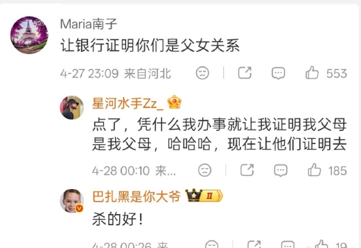 银行恶心人不是一回两回了,这位网友直接问到命门上了,“先让银行证明你们是父女关系