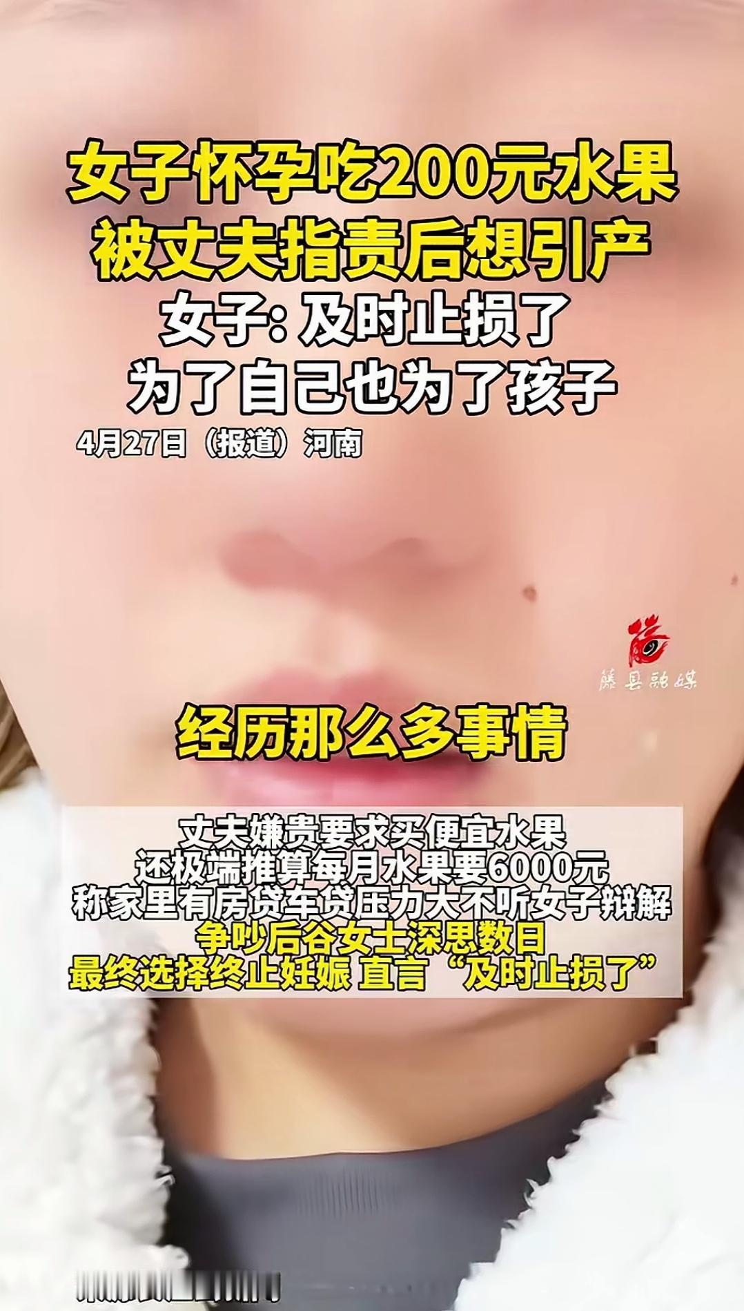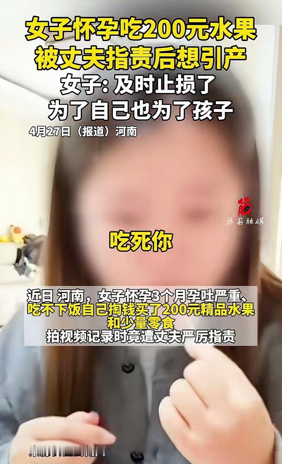 河南,一女子怀孕3个月孕吐严重,吃不下饭,为缓解孕吐,她自己掏钱买了200元精品水果和零食吃,不料丈夫嫌贵,严厉指责她说:别吃死了,吃死你!