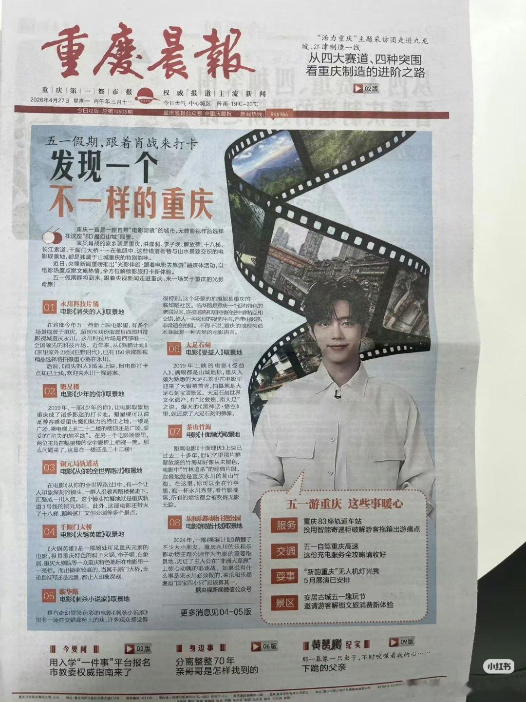 肖战又双聂叕登重庆报纸了!还是连续两天的头版,4月27日的重庆晨报和4月28日的重庆晚报,不愧是家乡宣传能手,官媒认证的骄傲!肖战邀你“五一”游重庆!