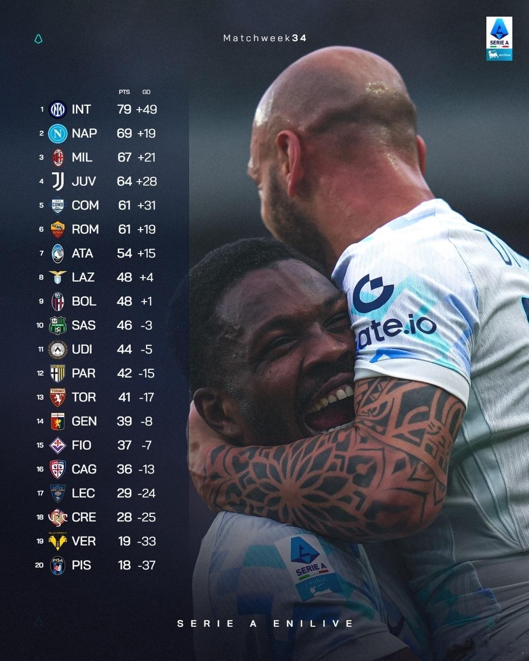 第34轮后意甲积分榜,国际米兰距离意甲金杯还差3分。国际米兰劳塔罗意甲
