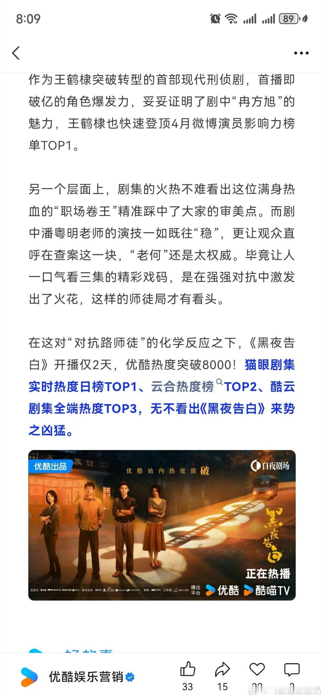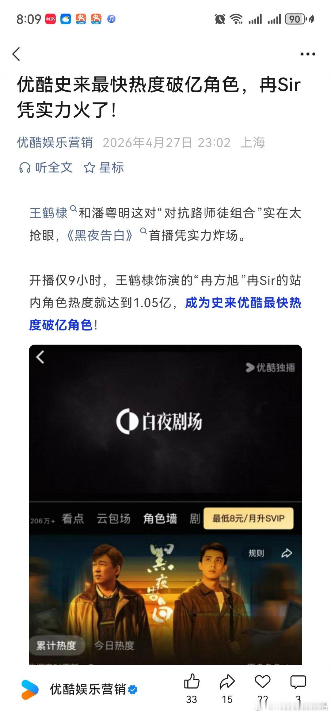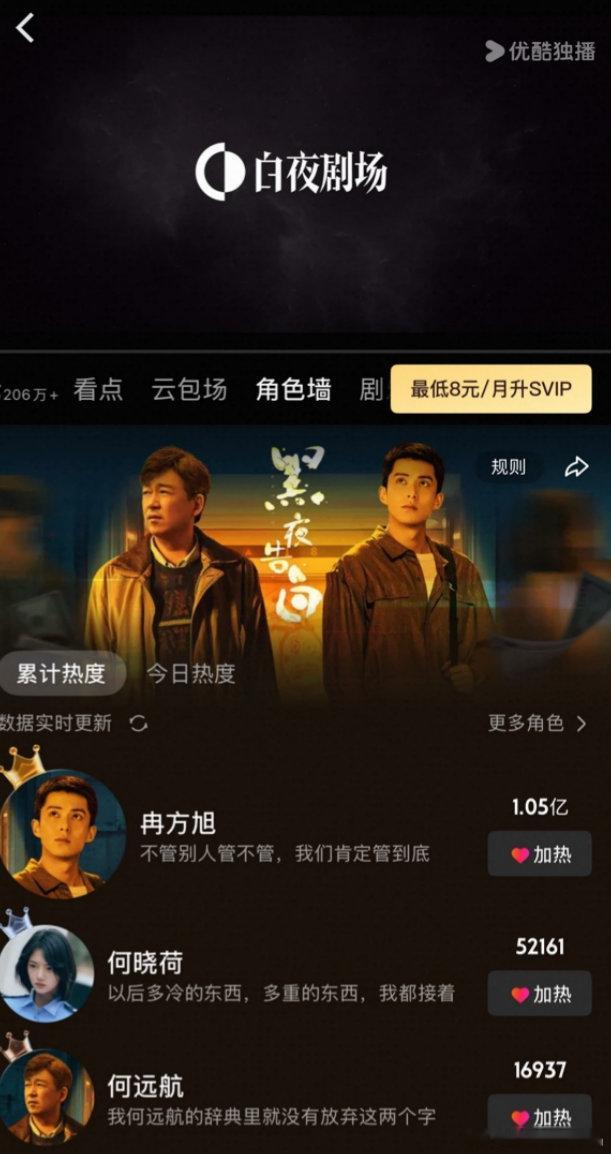 开播仅9小时,王鹤棣饰演的"冉方旭"冉 Sir 的站内角色热度就达到1.05亿,成为史来优酷最快热度破亿角色!恭喜王鹤棣!王鹤棣黑夜告白