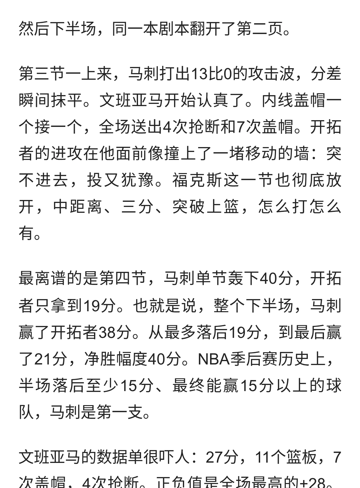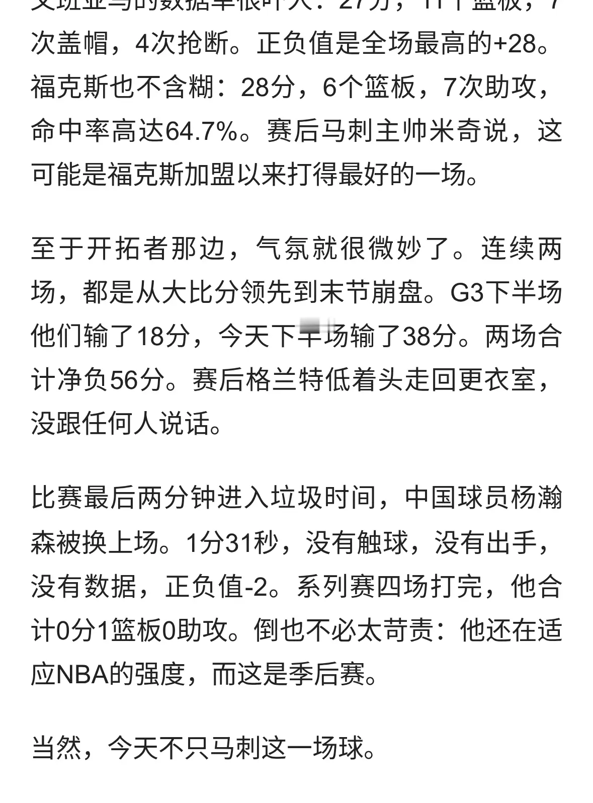 杨瀚森确实要感谢文班亚马。 开拓者首轮G4主场93比114输给马刺,比分差了