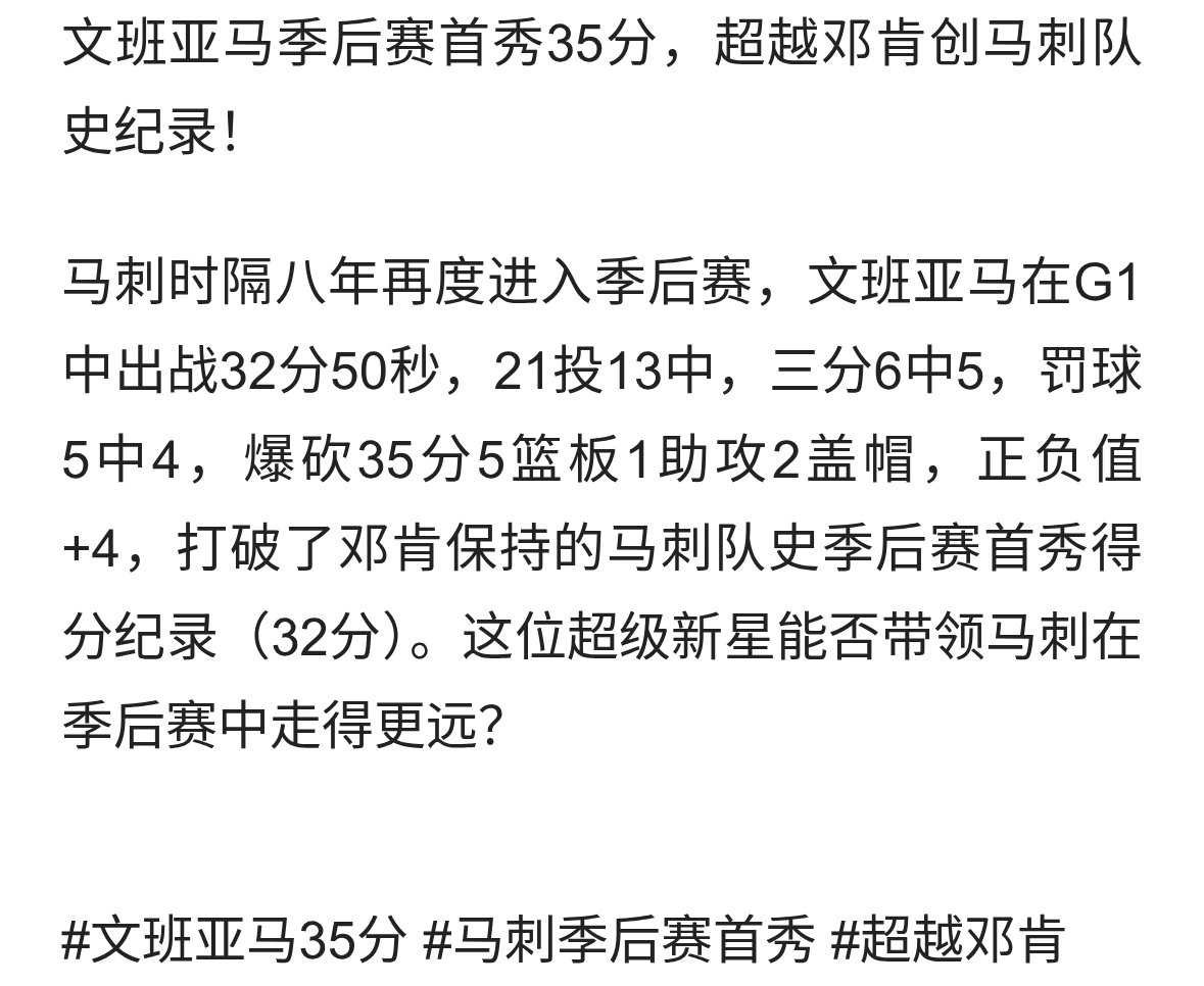 文班亚马35分创马刺季后赛首秀纪录!超越邓肯