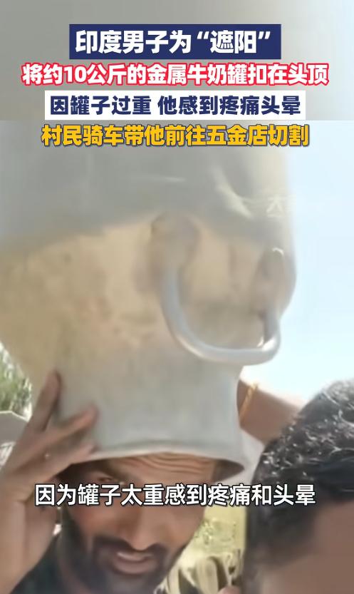 印度男子为“遮阳”将约10公斤的金属牛奶罐扣在头顶,村民骑车带他前往五金店切割-大象新闻