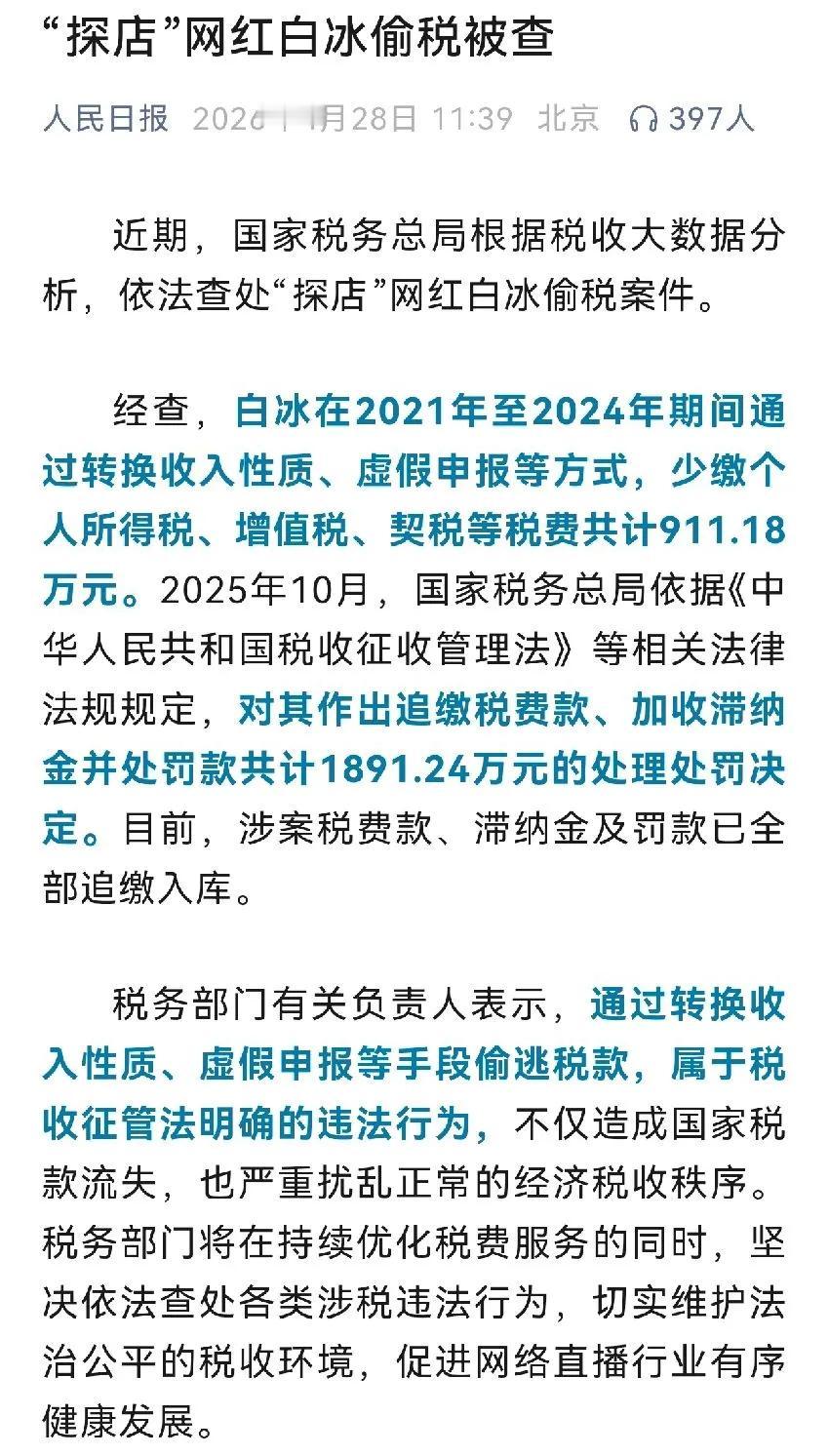 探店网红白冰因偷税漏税被查,罚款高达1891万,太离谱了。