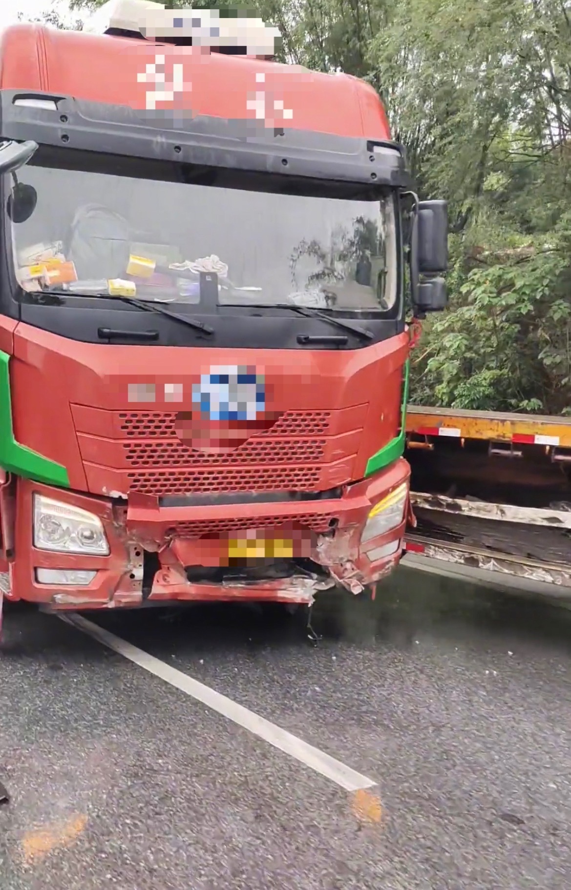 【玉林大王庙路口大拖挂车头撞歪后面】