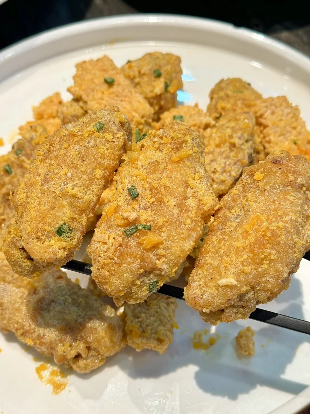 家常宝藏南京菜馆,咸蛋黄鸡翅外皮酥脆,裹满沙沙蛋黄,肉质鲜嫩多汁,咸香入味