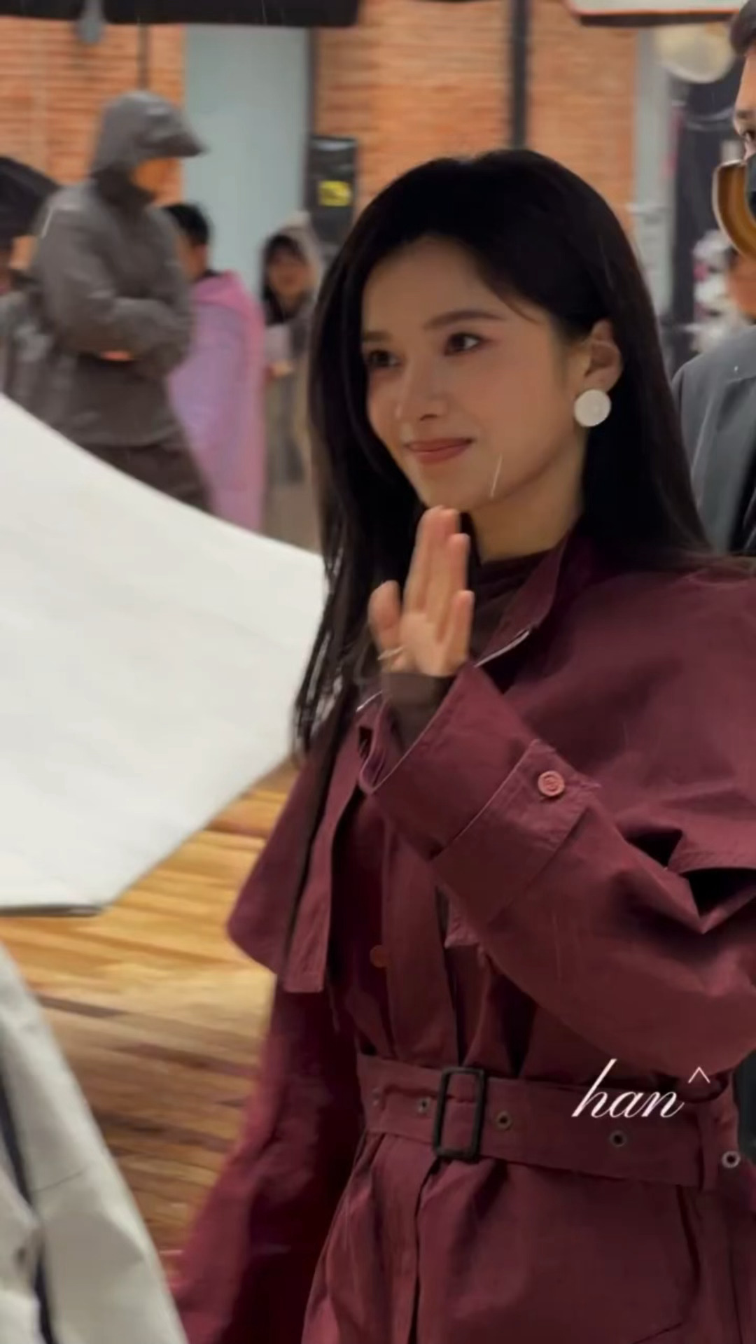 张婧仪酒红色风衣造型张婧仪雨中红风衣造型