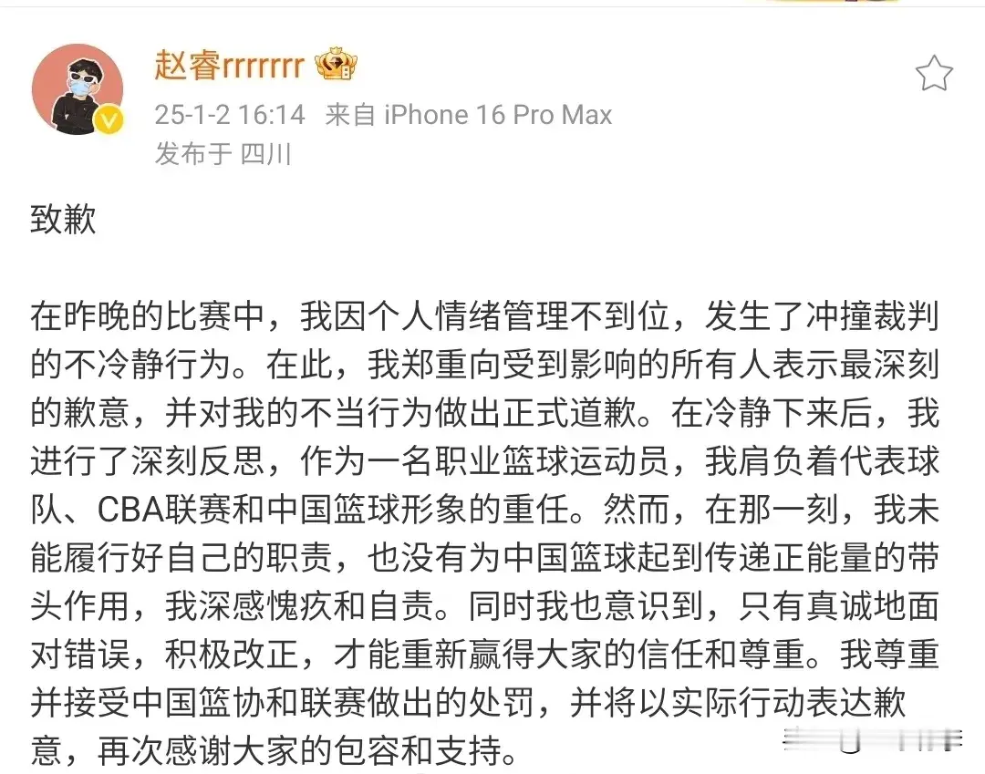 第二,中国篮协,出了事不能只对涉事球员一罚了之,出事的原因是什么,如果没有多次误判的累计,一个有着多年经验的成熟球员会出现这种不理智的反应吗?赵睿撞裁判 赵睿道歉 杨宏峰