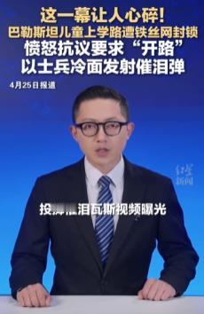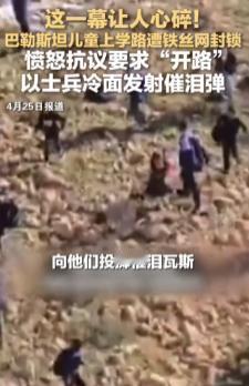 巴勒斯坦儿童上学路遭铁丝网封锁,愤怒抗议要求“开路”,以士兵冷面发射催泪弹。