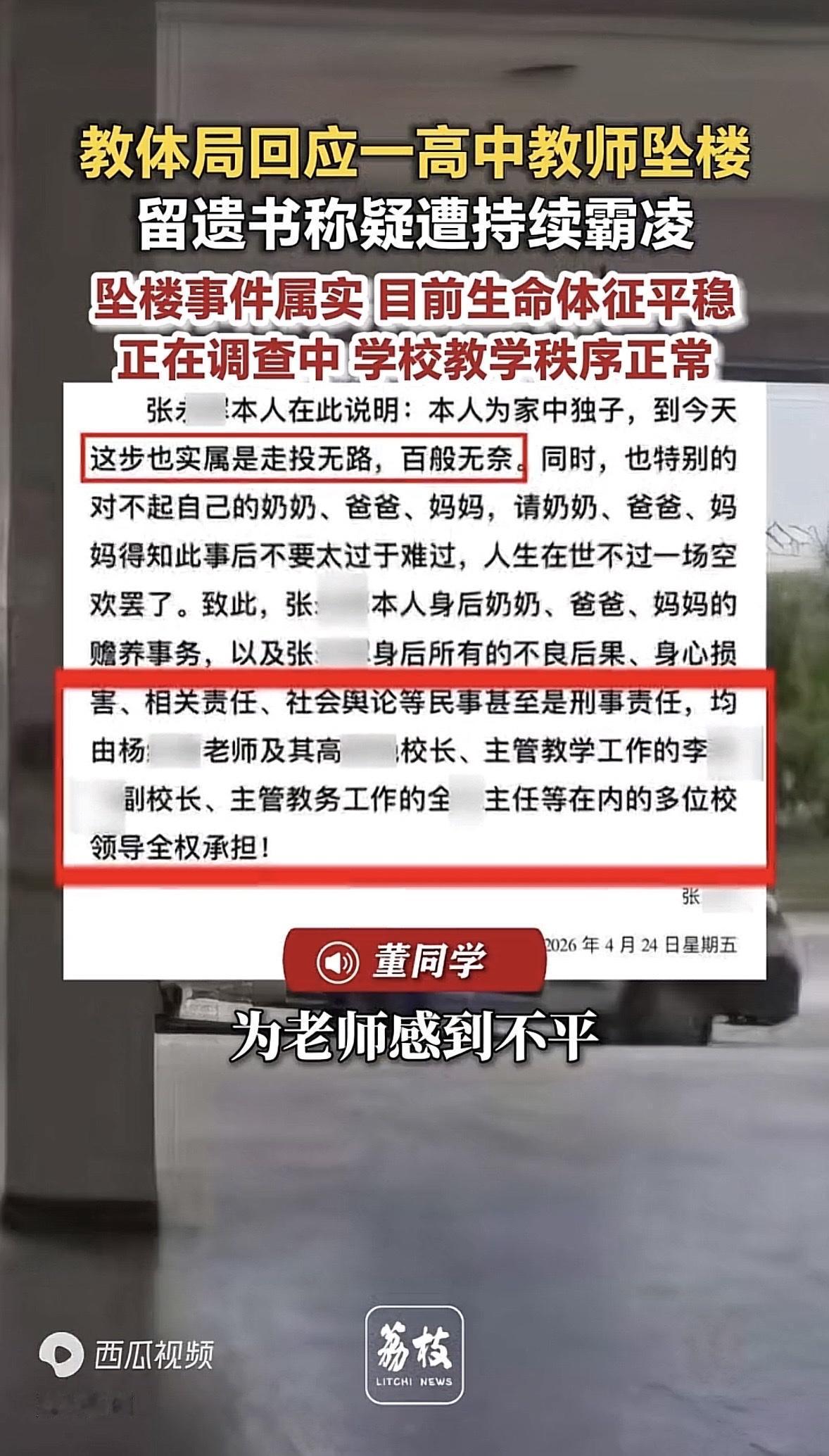 希望张老师能挺过来,也希望那个把他逼上绝路的人,能真正付出代价!