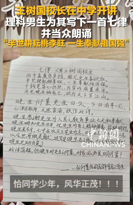 1.中国新闻网-王树国校长在中学开讲 理科男生为其写下一首七律并当众朗诵 “半世耕耘桃李旺,一生奉献祖国强”