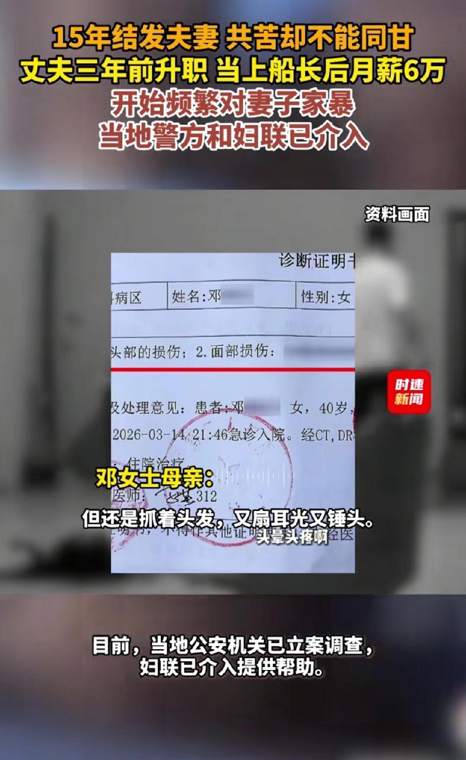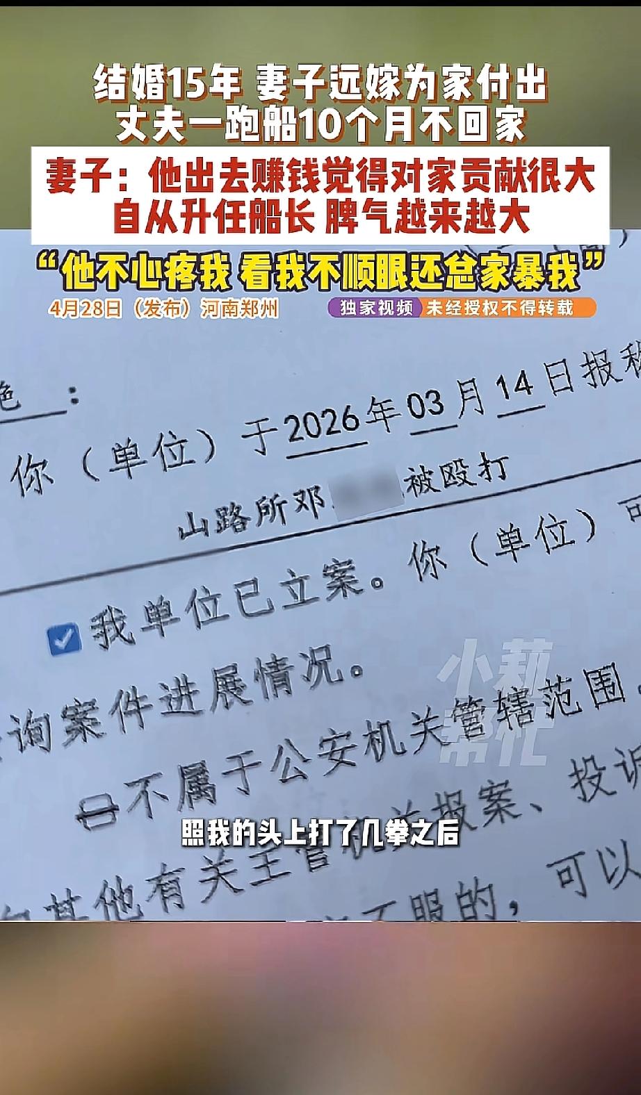 太心寒!河南郑州,男人升职成船长,月薪有2000涨到五六万后,妻子本以为是苦尽甘来。哪成想,丈夫性情大变频繁家暴,甚至当着老人孩子面动手,岳母下跪求情都不行,一年在家五个多月,四个月都在施暴,妻子说:钱是他赚的不叫俺花!