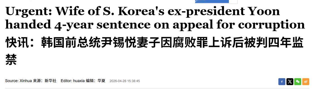 4 月 28 日下午,韩国首尔高等法院的一纸判决,让前总统尹锡悦的妻子金建希彻底从 "第一夫人" 的宝座跌进了铁窗生涯,二审获刑 4 年,还得交 5000 万韩元罚金,这比她一审的 1 年 8 个月刑期足足翻了一倍多,特检组当初求刑 15 年的狠劲总算有了点回响t。