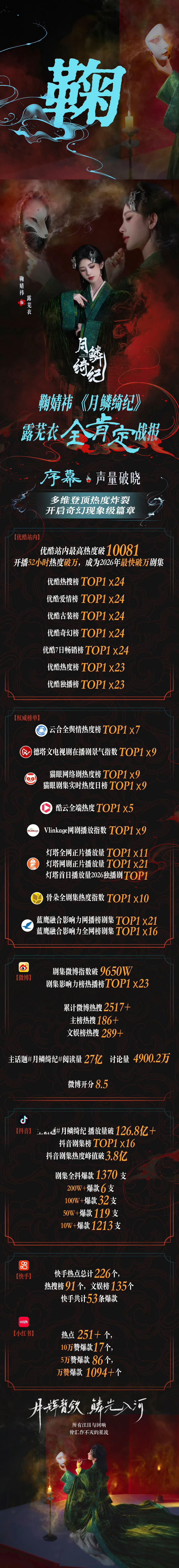 鞠婧祎工作室发月鳞绮纪收官战报《月鳞绮纪》露芜衣收官战报‼️鞠婧祎好牛!鞠婧祎露芜衣 ✅ 优酷站内最高热度破10081,开播52h破万✅ 云合、德塔文、灯塔、猫眼等多平台榜单多次TOP1✅ 微博主话题阅读量27亿,抖音主话题播放破126亿+✅ 鞠婧祎&露芜衣相关全平台热搜超1450条