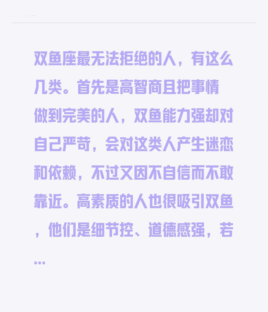 双鱼座最无法拒绝的人,有这么几类。 首先是高智商且把事情做到完美的人,双鱼能力强