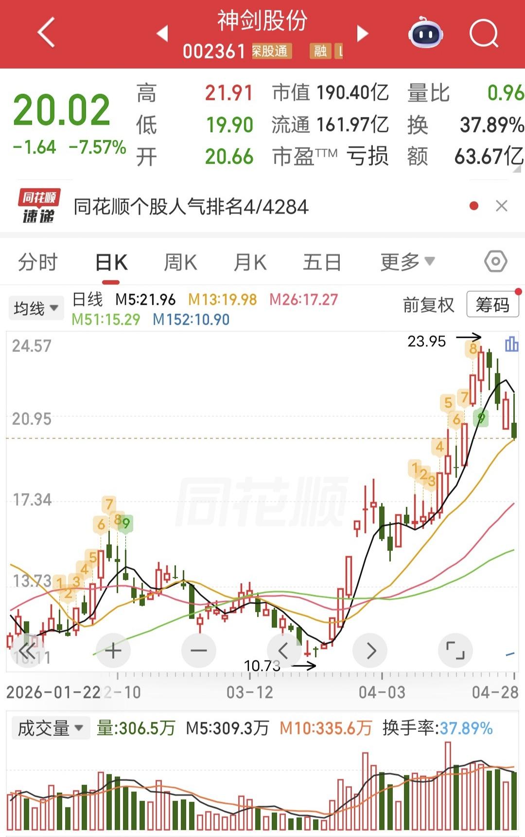 今天近期热门股神剑股份大跌7%。