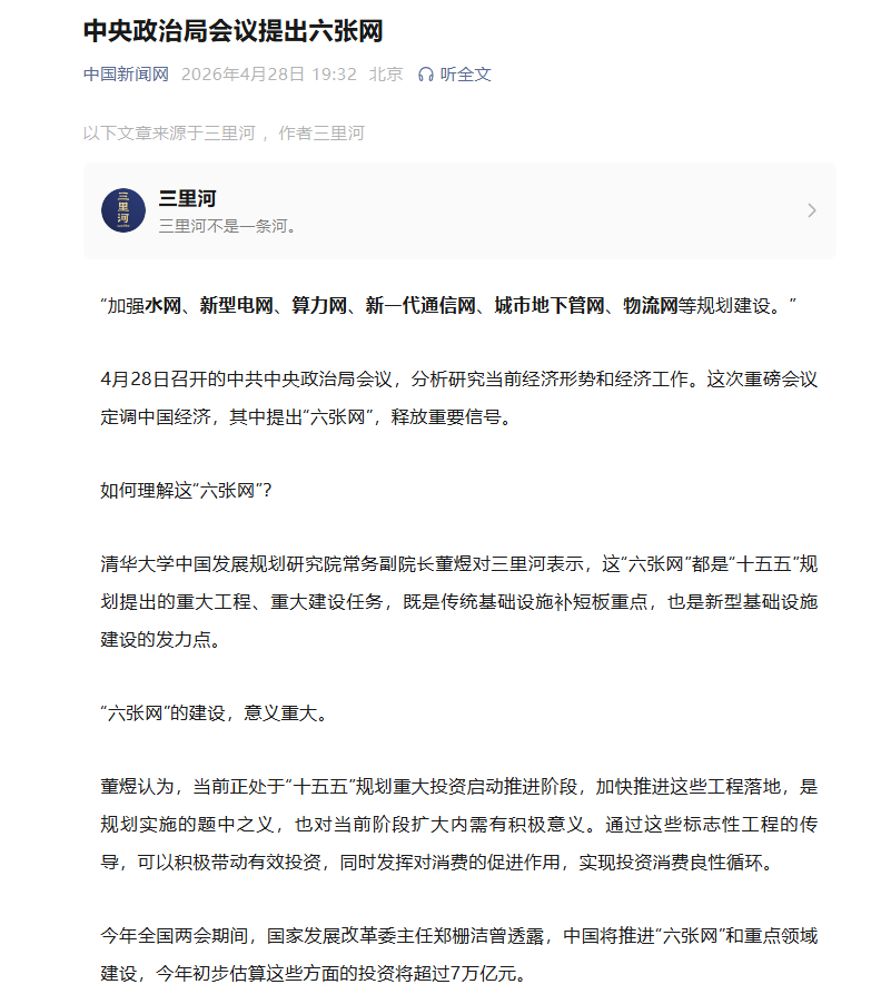 【中国新闻网:中央政治局会议提出六张网 “六张网”的建设意义重大】中国新闻网发文,“加强水网、新型电网、算力网、新一代通信网、城市地下管网、物流网等规划建设。”4月28日召开的中共中央政治局会议,分析研究当前经济形势和经济工作。这次重磅会议定调中国经济,其中提出“六张网”,释放重要信号。