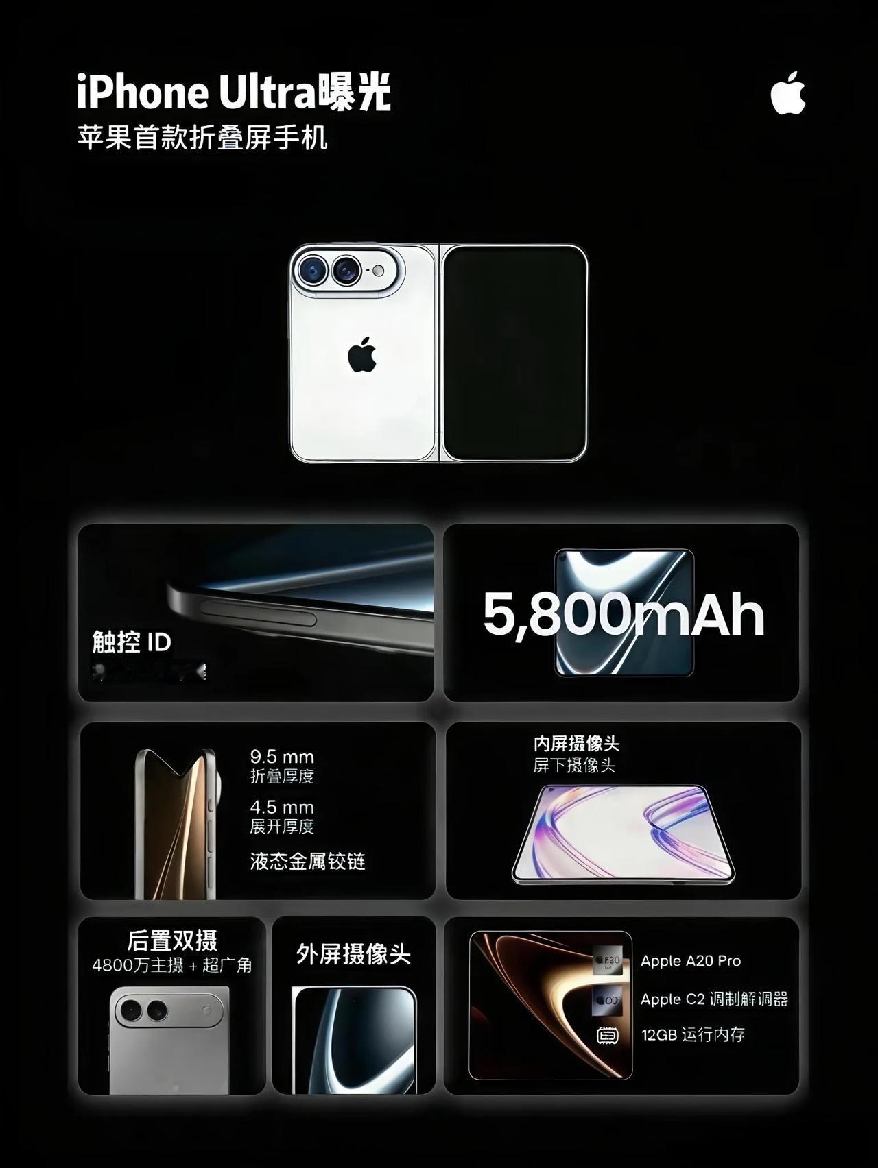 苹果折叠屏命名确认为iPhone Ultra,于今年9月份同iPhone18系列一起发布。简单看下配置: