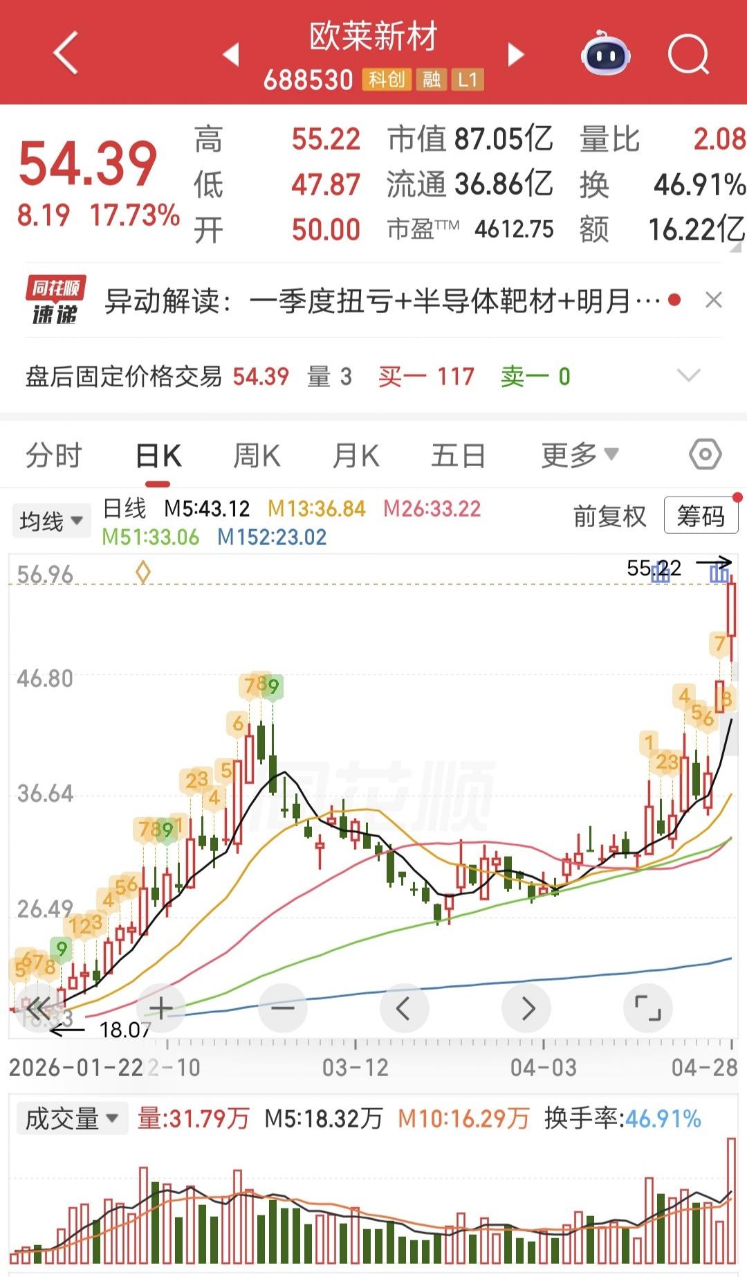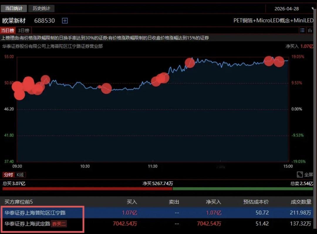 炒新一族双账户爆买1.77个亿! 今天欧莱新材高开高走再创新高。 盘后龙虎榜