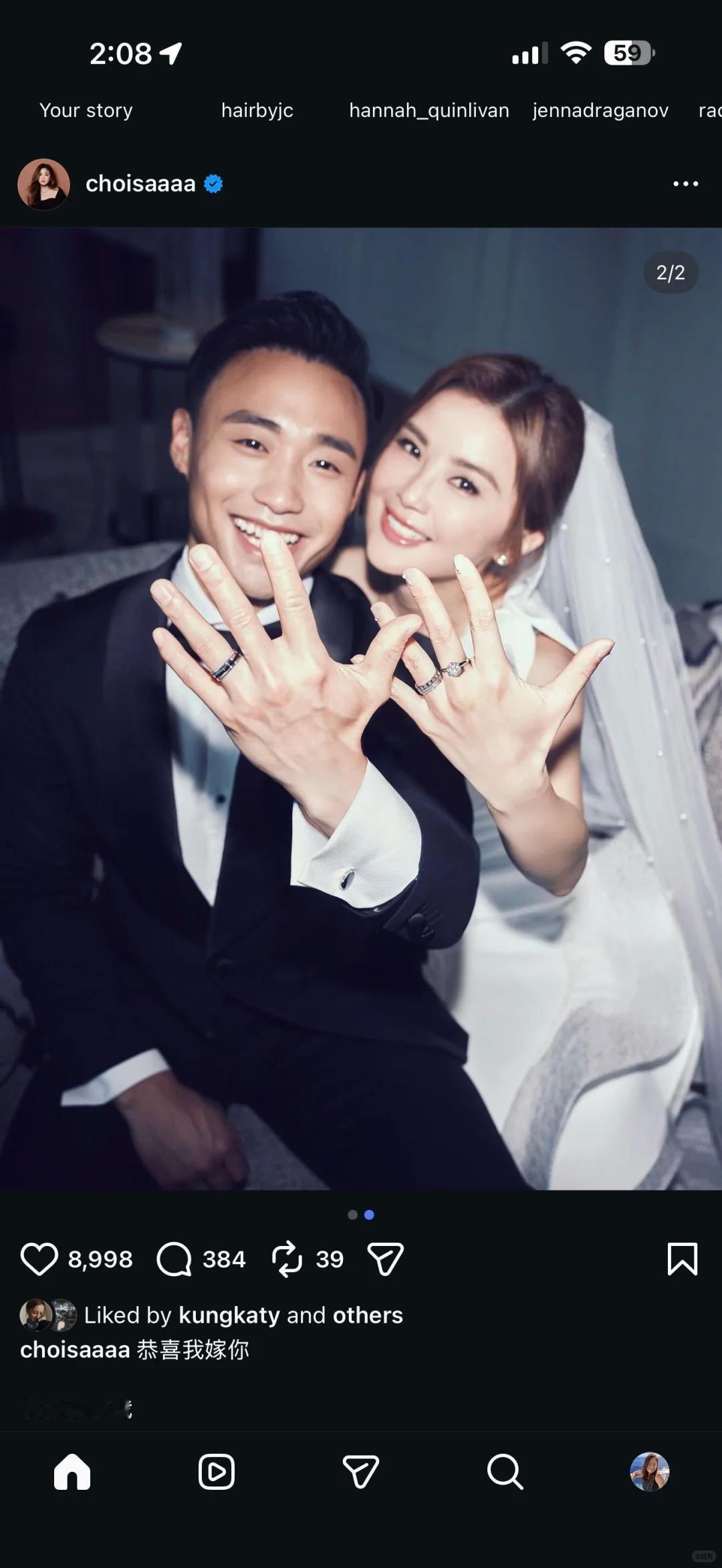 蔡卓妍官宣结婚了!!!阿Sa的结婚对象叫林俊贤,两人缘分始于健身房,男方作为关智