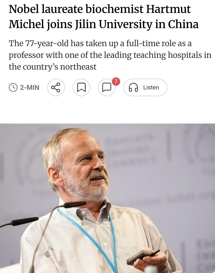 外媒:诺贝尔化学奖得主哈特穆特·米歇尔全职加盟中国吉林大学