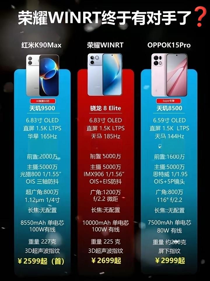 荣耀WINRT才是真正的机皇,直接把友商按在地上摩擦。2699起直接上骁龙8 Elite+10000mAh单电芯的组合,性能续航双王炸,直接把续航和性能拉到了天花板。对比友商的同档机型,优势一目了然。天马185Hz高刷屏搭配IMX906主摄,游戏和拍照都没短板,这配置和定价,就是来终结中端机市场的,这波降维打击,友商直呼“接不住”啊。