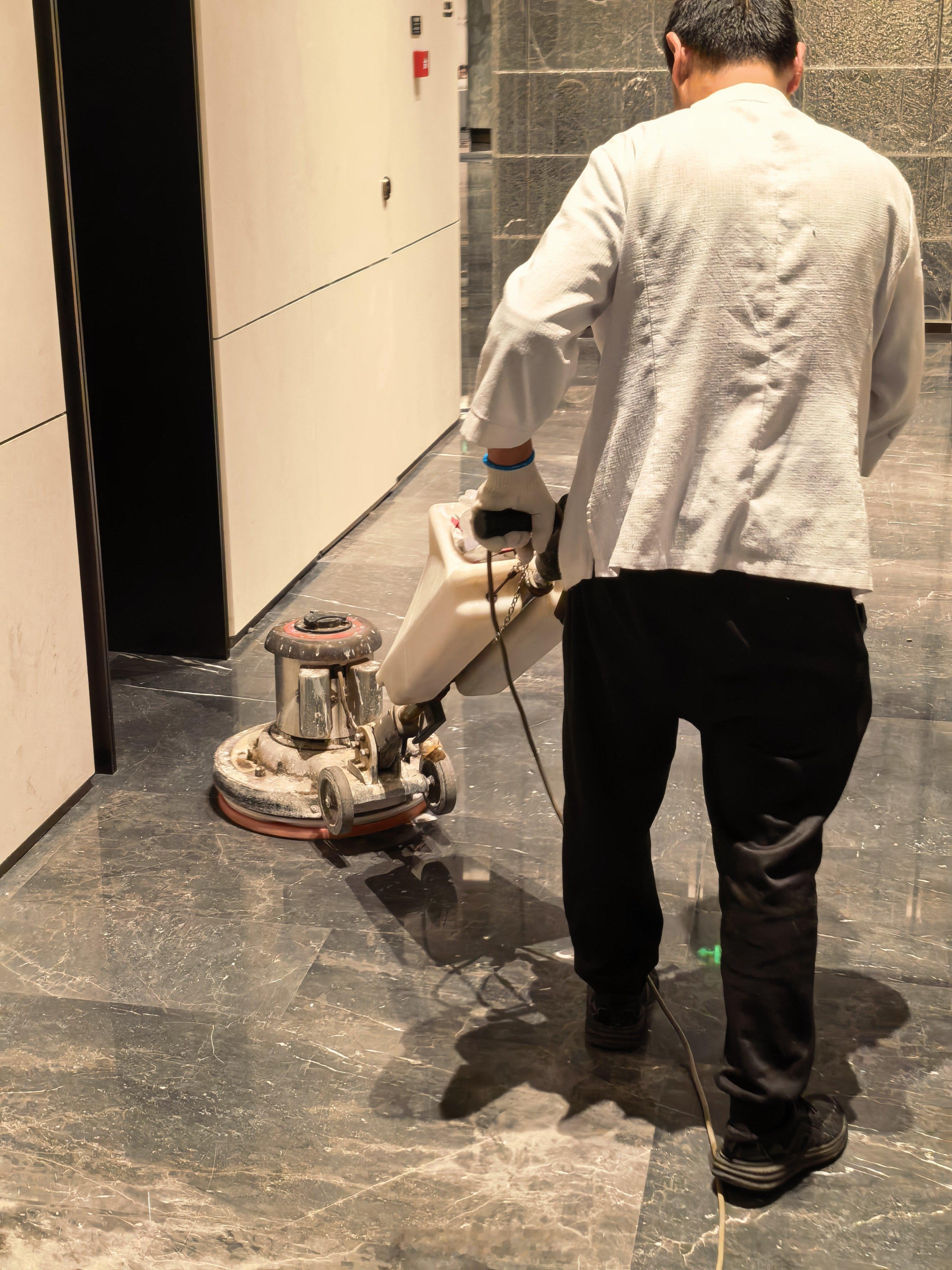 酒店工作人员在做大理石地面的保养。突然觉得扫地机器人还可以增加一个功能:大理石抛