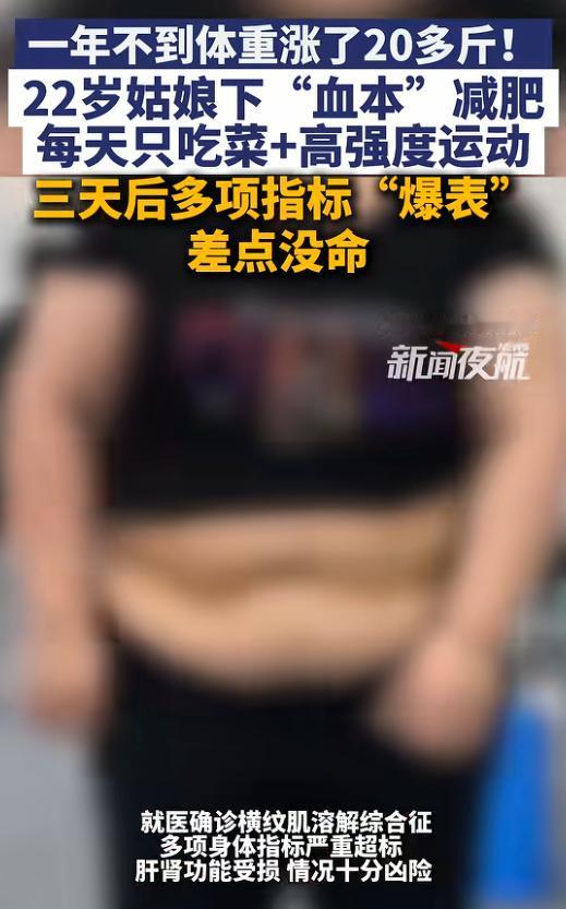 2026年4月27日报道,浙江一名年轻女子毕业未满一年,体重暴涨二十多斤,急于减脂的她长期只食用蔬菜,搭配超高强度运动强行减重,短短数日便出现恶心乏力不适,尿液异常呈酱油色,就医后被诊断为横纹肌溶解症,网友纷纷感慨盲目减肥得不偿失,健康才是一切的根本。