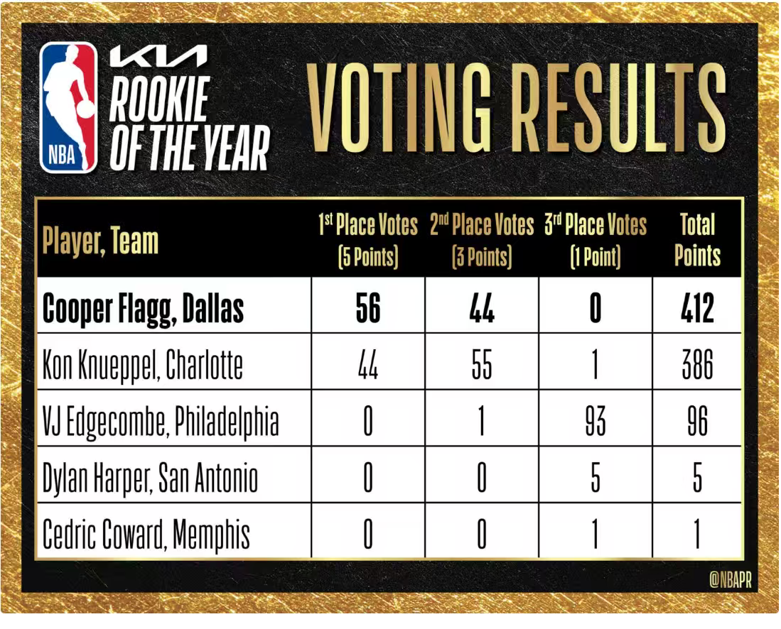NBA官网在2026年4月28日 上午7:37公布:独行侠的库珀·弗拉格击败了前杜克队友、夏洛特的康·克努佩尔,赢得了NBA年度最佳新秀奖。