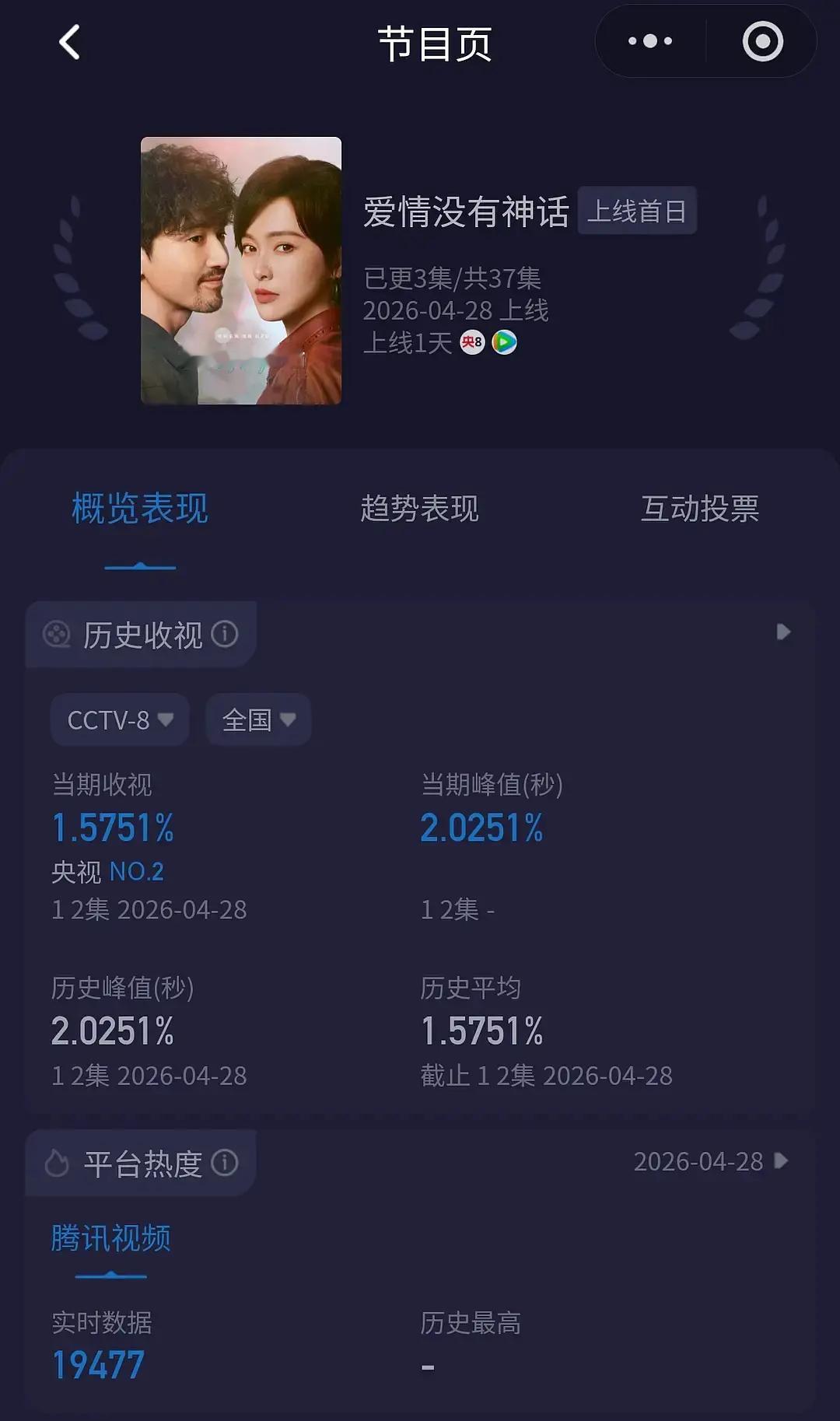 爱情没有神话3集已阅,首日热度没破20000太正常了,CVB也滑铁卢了。前三集充