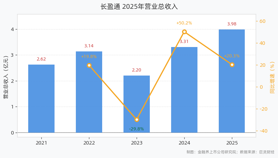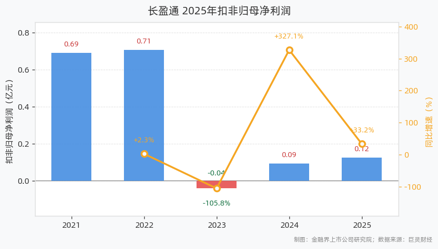 4月28日,长盈通发布2025年年报。报告显示,2025年公司营业总收入为3.98亿元,同比增长20.32%;归母净利润为0.24亿元,同比增长33.37%;扣非归母净利润为1246.52万元,同比增长33.17%;基本每股收益0.19元,加权平均ROE为1.99%;经营活动净现金流为2075.22万元,同比增长161.82%。