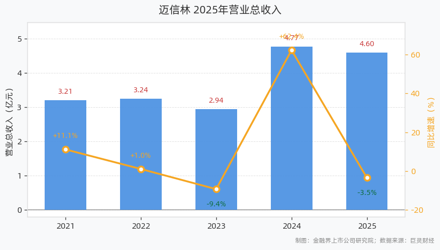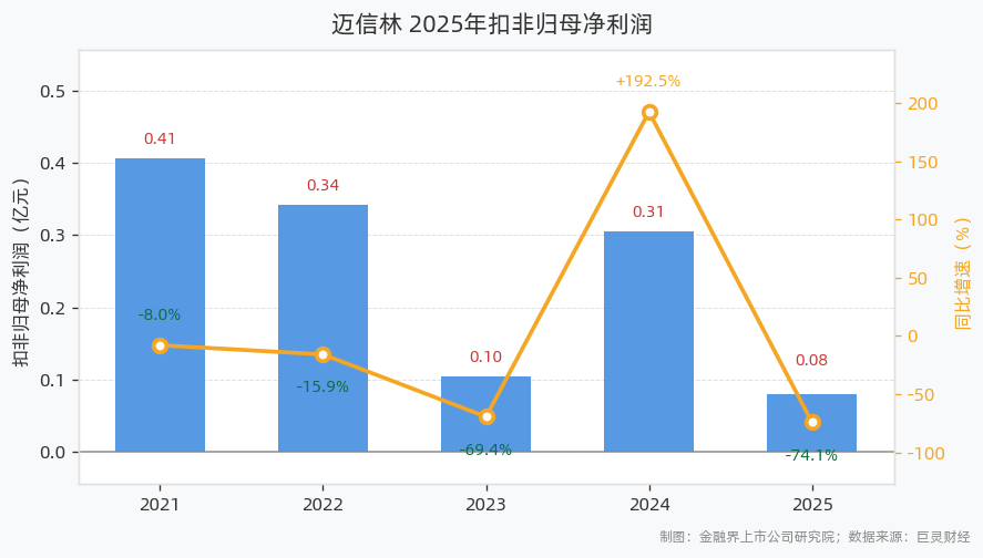 4月28日,迈信林发布2025年年报。报告显示,2025年公司实现营业总收入4.60亿元,同比下滑3.52%;实现归母净利润0.18亿元,同比下滑61.40%;实现扣非归母净利润792.86万元,同比下滑74.07%;基本每股收益为0.12元,加权平均净资产收益率为2.31%;经营活动产生的现金流量净额为6.82亿元,同比增长415.01%。