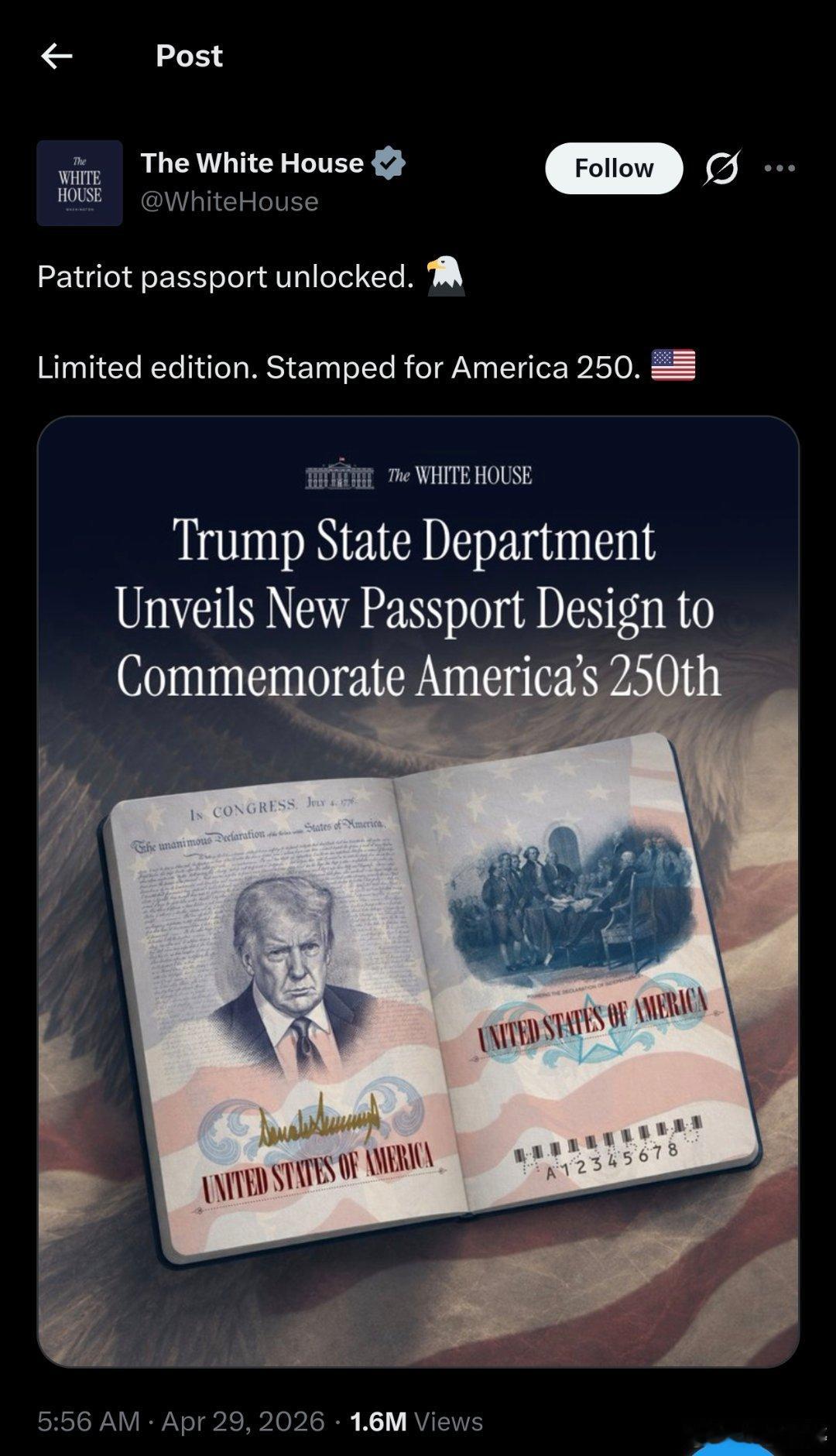 白宫还官宣了美国建国250周年限量版护照:将印有当代圣人·转世耶稣·子弹躲避者·黄金追随者·霍尔木兹海峡守护者·美利坚第一帝皇·宇宙第一懂王·川普大统领的头像